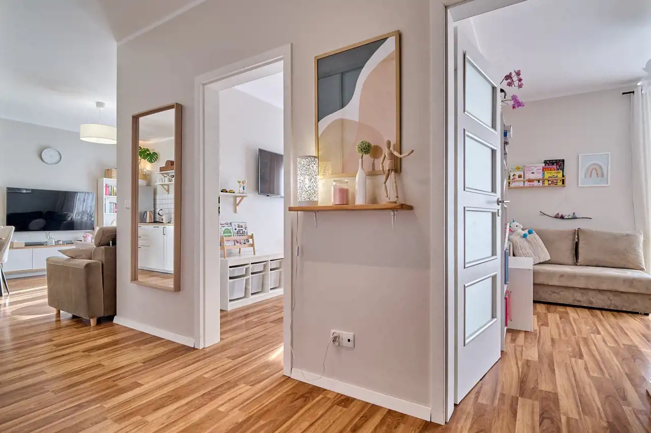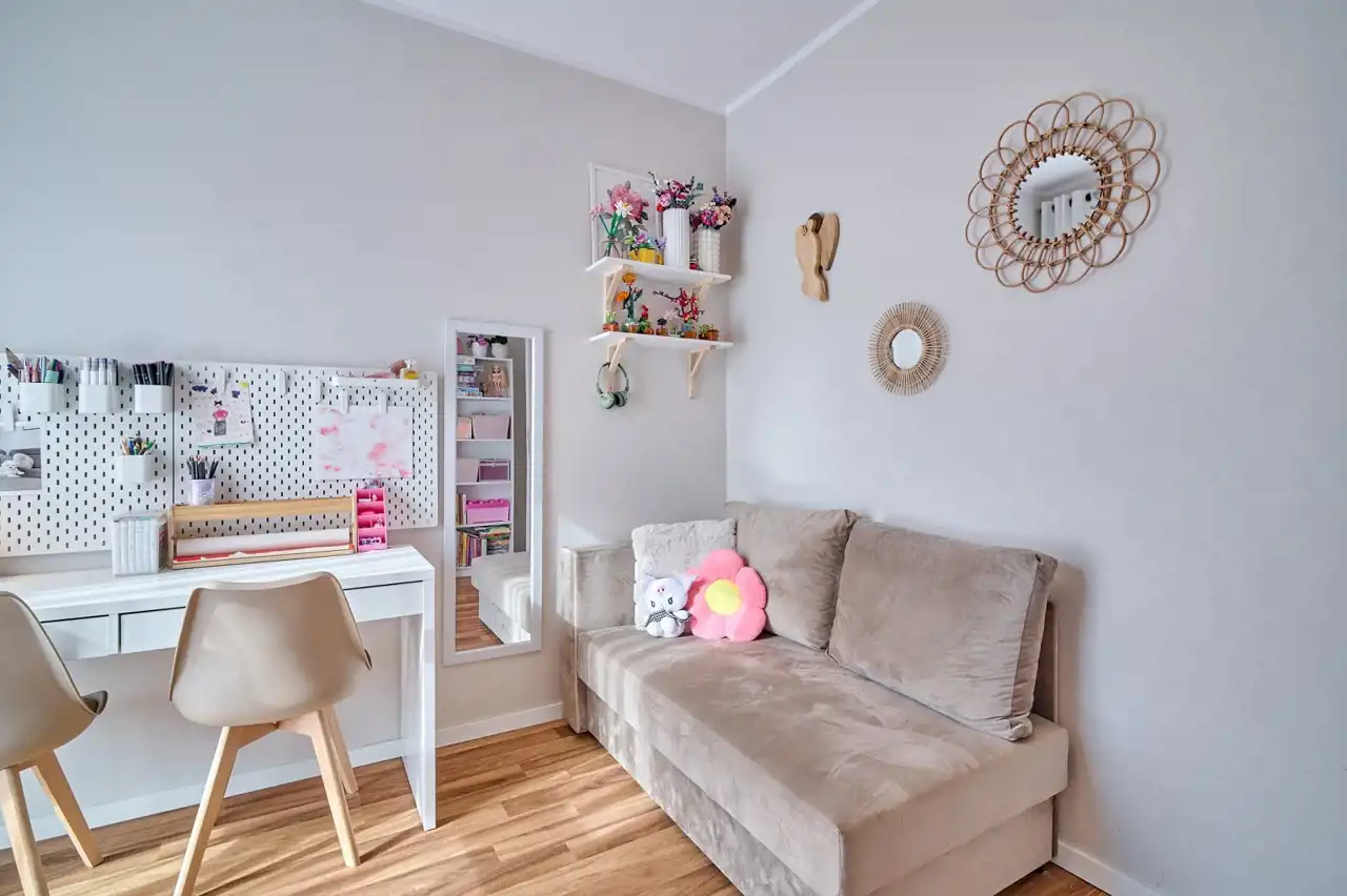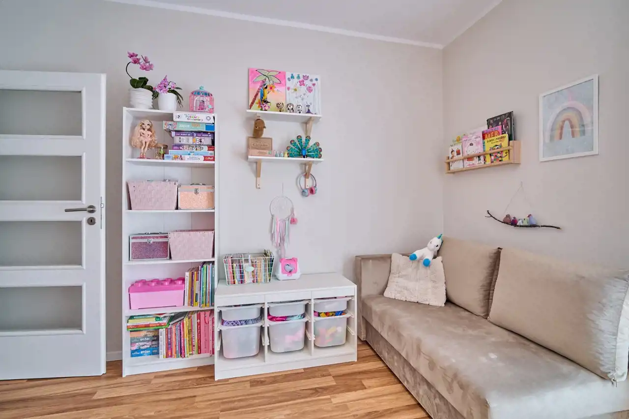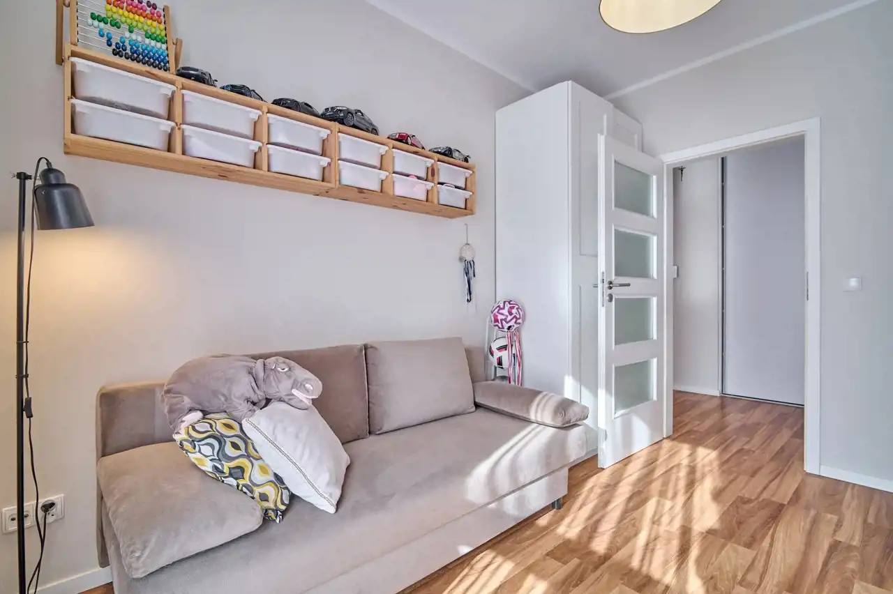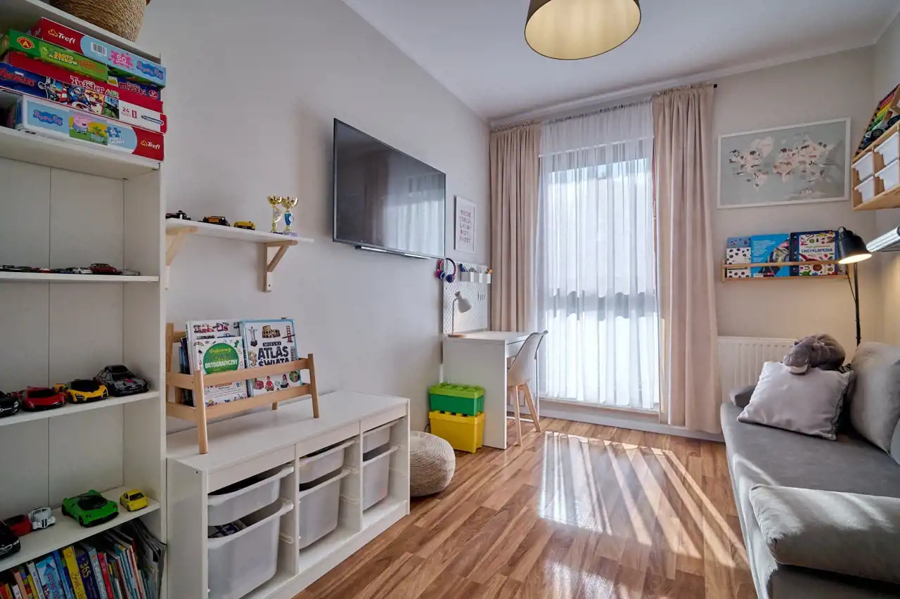 Dwa pokoje obecnie pełnią funkcję pokoi dziecięcych, jednak z łatwością można je przekształcić w sypialnię, gabinet czy przestrzeń do pracy zdalnej.