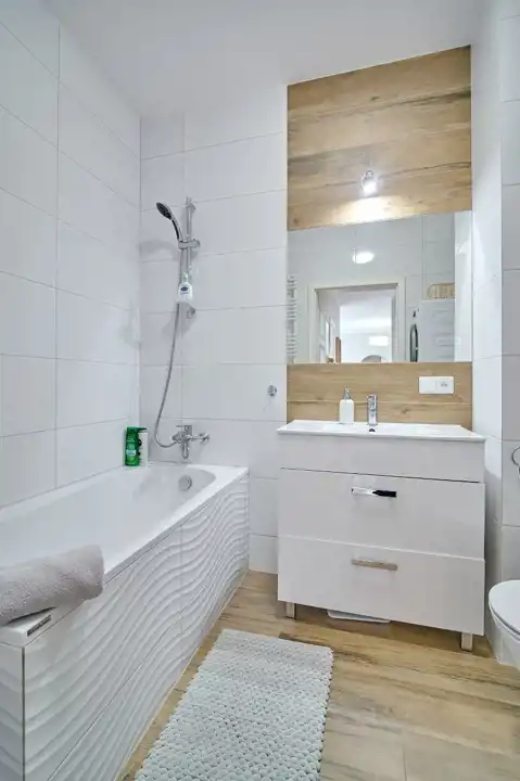 Łazienka w nowoczesnej glazurze, wyposażona w wygodną wannę, która z pewnością umili chwile miłośnikom dłuższych kąpieli.
