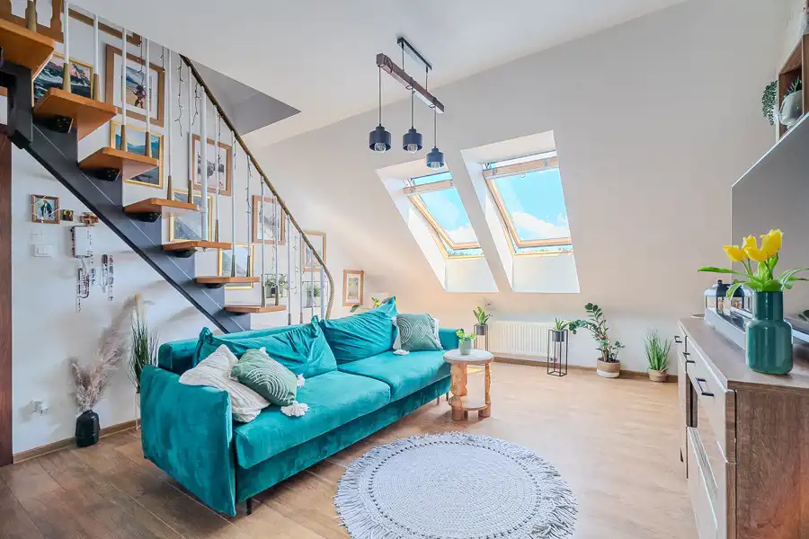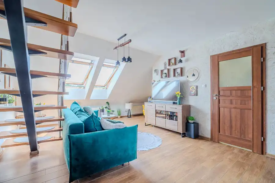 Mieszkanie wyróżnia staranne wykończenie i klimatyczne wnętrze. Przestronny salon został zaprojektowany z myślą o otwartości i funkcjonalności. Znajduje się tu wydzielony kącik z wygodnym fotelem, który stworzy idealne warunki do czytania i relaksu. Naturalne światło płynące przez okna dodaje przestrzeni ciepła i przytulności. Z salonu przejście do kuchni, która harmonijnie łączy się z jadalnią, tworząc przytulne i funkcjonalne miejsce. Duży drewniany stół oraz miękkie krzesła są idealne do wspólnych posiłków lub przyjmowania gości. Przestronna i jasna sypialnia to oaza spokoju. Dzięki dużym oknom połaciowym pomieszczenie jest pełne światła, co sprzyja wypoczynkowi i regeneracji sił.