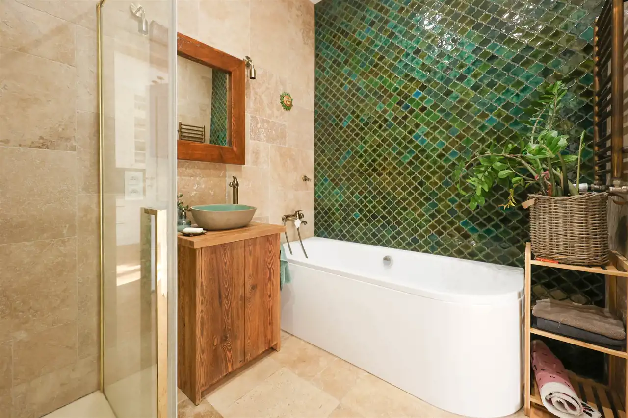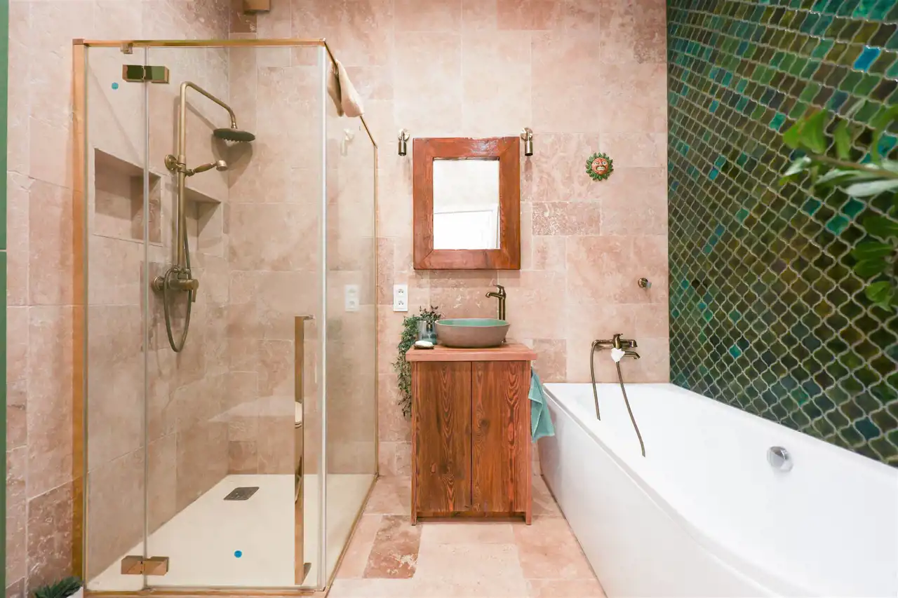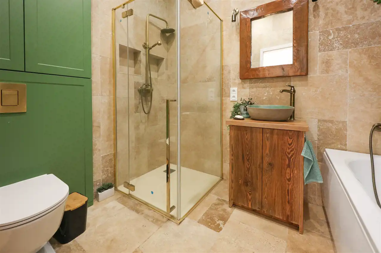 Stylowa i nietuzinkowa – znajdziesz tu zarówno wannę jak i prysznic, co zapewnia pełną wygodę.