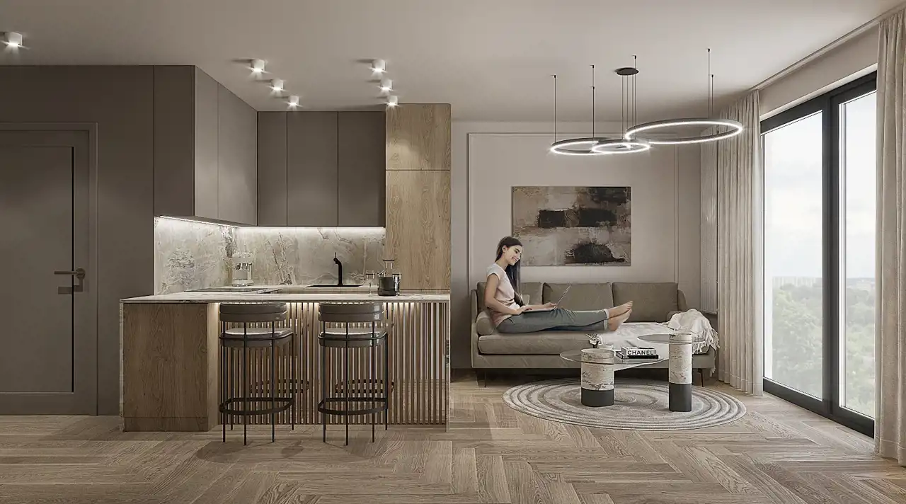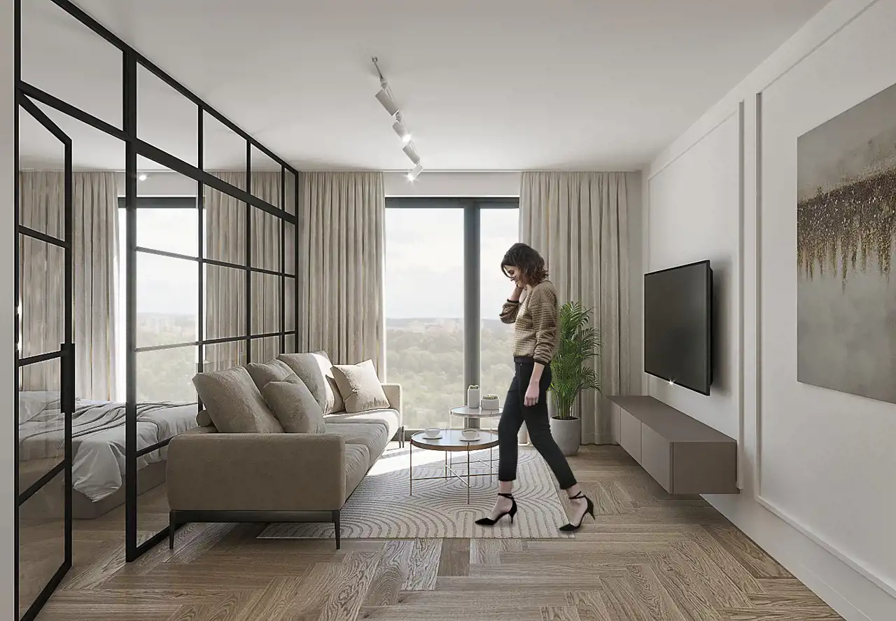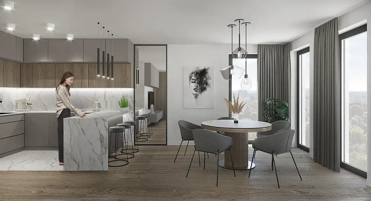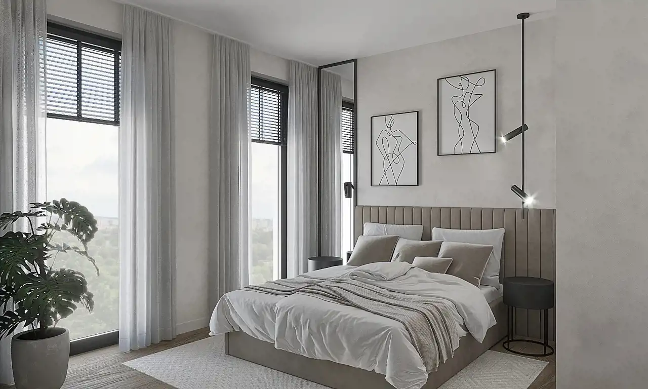 Mieszkanie wyróżnia się bardzo dobrym rozkładem pomieszczeń oraz wysokimi sufitami (3,0–3,10 m), które potęgują poczucie przestrzeni i komfortu. Duże przeszklenia zapewniają doskonałe doświetlenie wnętrza. W całym mieszkaniu zastosowano ogrzewanie podłogowe, co zwiększa wygodę użytkowania.