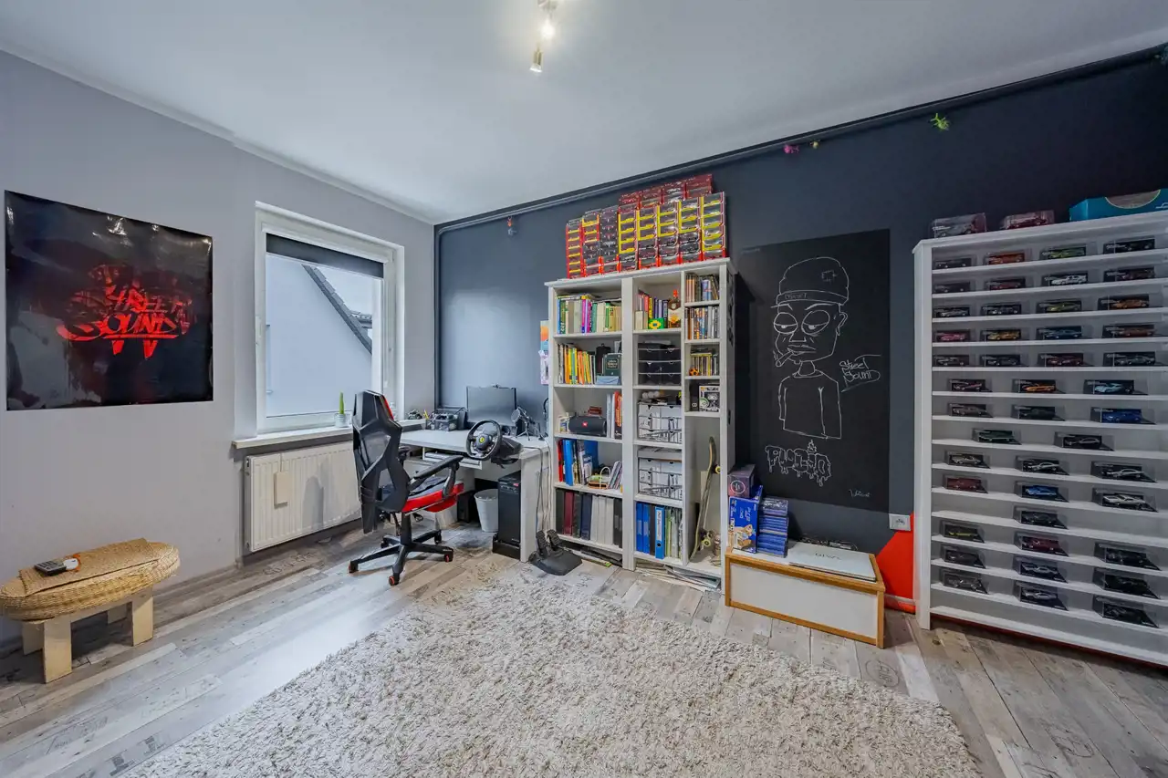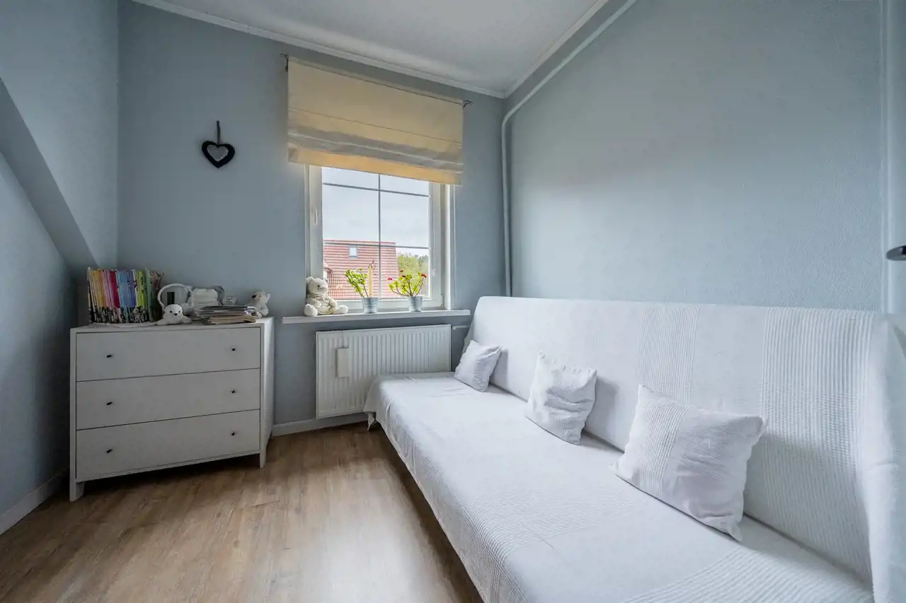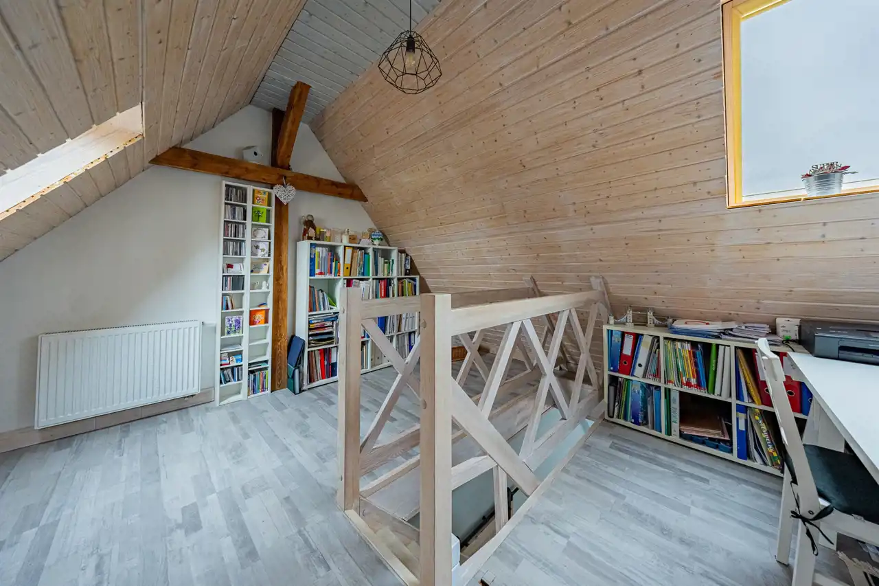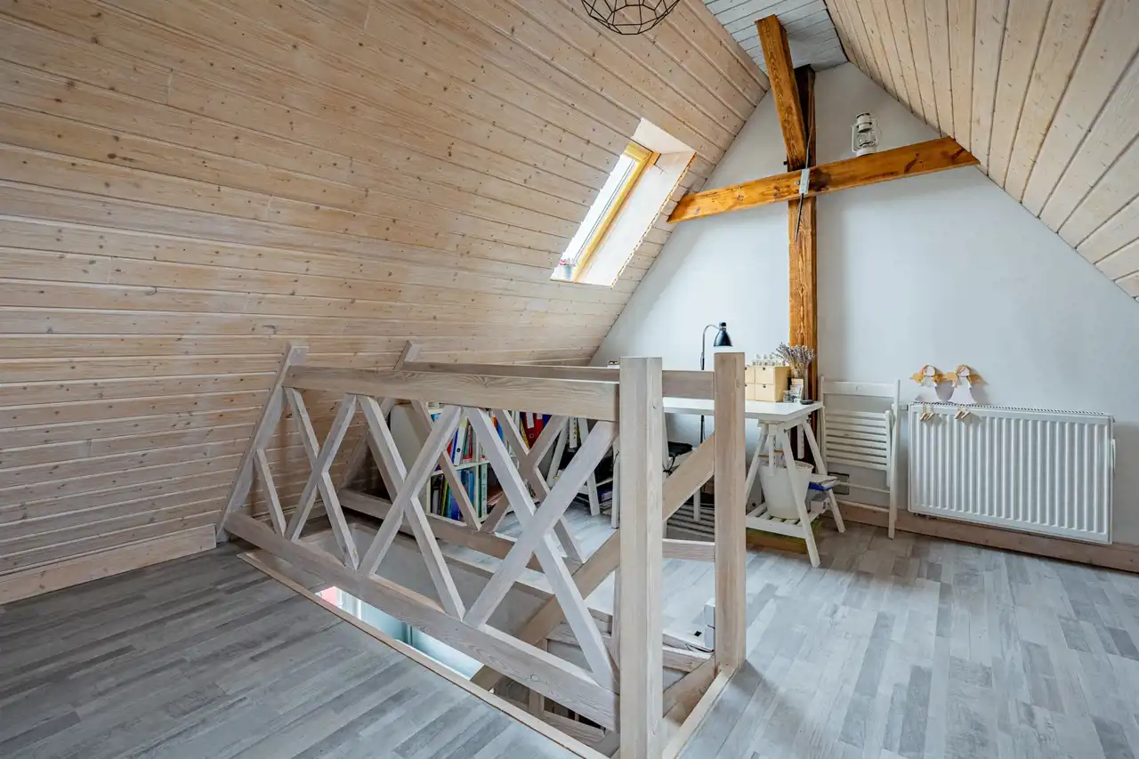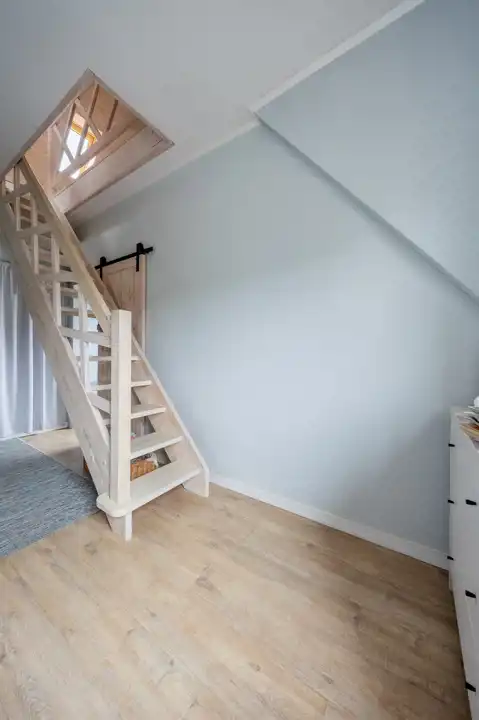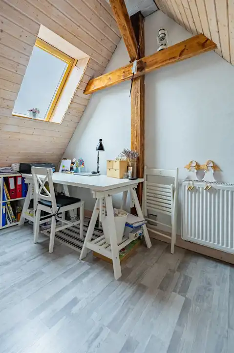 Poddasze z potencjałem: Dodatkowy, czwarty pokój zaaranżowany na poddaszu, na które prowadzą oryginalne drewniane schody z dekoracyjną balustradą. Pokój idealny jako biuro, sypialnia gościnna lub pokój hobby.