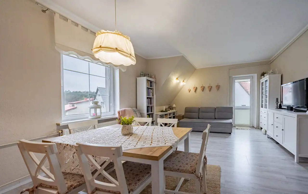 Przestronność i funkcjonalność: 69 m2 powierzchni użytkowej i około 90-100 m2 powierzchni przypodłogowej, obejmującej salon, dwie sypialnie, dodatkowy pokój urządzony na poddaszu oraz osobną, małą garderobę.
