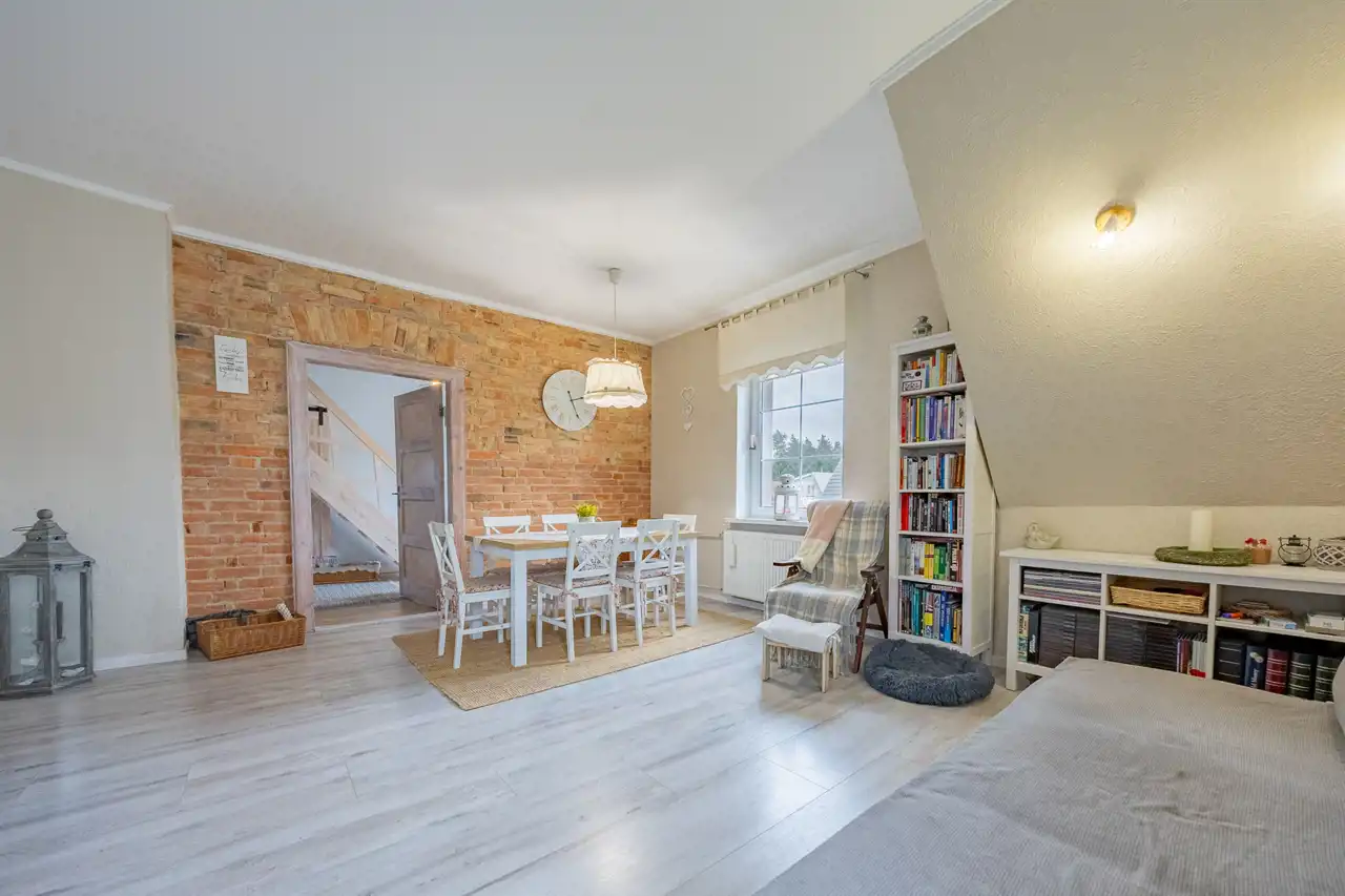 Klimatyczne wnętrza: Oryginalna ściana z czerwonej cegły nadaje niepowtarzalny charakter, a liczne elementy z prawdziwego drewna tworzą ciepłą atmosferę.