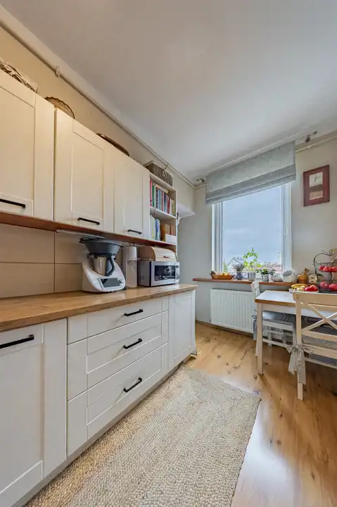 Mieszkanie 3 pokojowe, czwarty pokój stanowi zaadaptowana część strychu. Salon bardzo przestronny, świetnie doświetlony, z wyjściem na duży balkon (5,64 m2) z nową balustradą. Sypialnia połączona z pojemną garderobą. Kuchnia wyposażona w zabudowę meblową i sprzęt AGD (płyta gazowa, piekarnik elektryczny, okap), które pozostają w cenie mieszkania. Łazienka z oknem, wyposażona w kabinę prysznicową. Okna wyposażone w rolety i część w moskitiery.