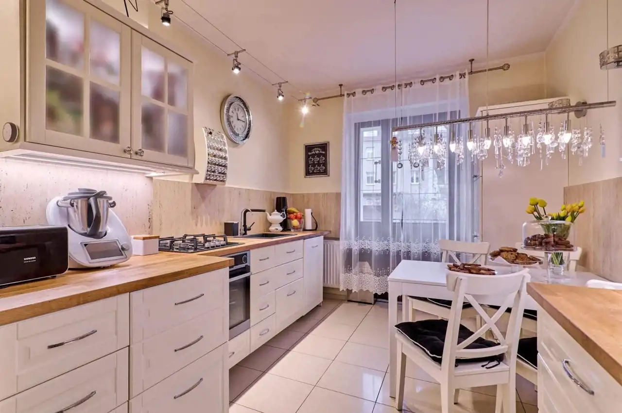 - Kuchnia o pow. 13,2m2 z wyjściem na balkon: centralnym punktem mieszkania jest przestronna, nowoczesna kuchnia w stylu prowansalskim, która jest w pełni wyposażona. Z balkonu widok na ogród różany. Zabudowa i sprzęt AGD w cenie (płyta gazowa oraz piekarnik firmy Electrolux z funkcją pieczenia na parze, zmywarka Siemens),