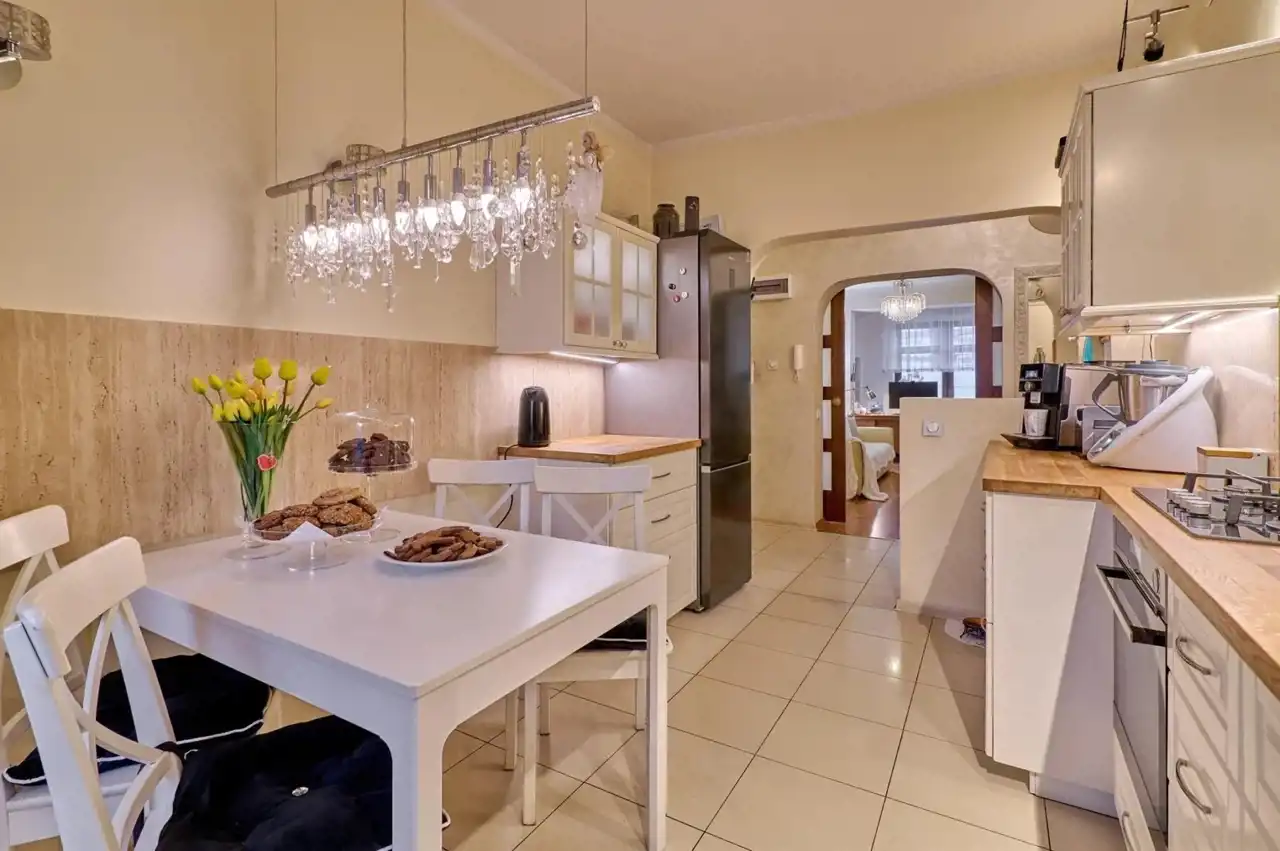 - Kuchnia o pow. 13,2m2 z wyjściem na balkon: centralnym punktem mieszkania jest przestronna, nowoczesna kuchnia w stylu prowansalskim, która jest w pełni wyposażona. Z balkonu widok na ogród różany. Zabudowa i sprzęt AGD w cenie (płyta gazowa oraz piekarnik firmy Electrolux z funkcją pieczenia na parze, zmywarka Siemens),