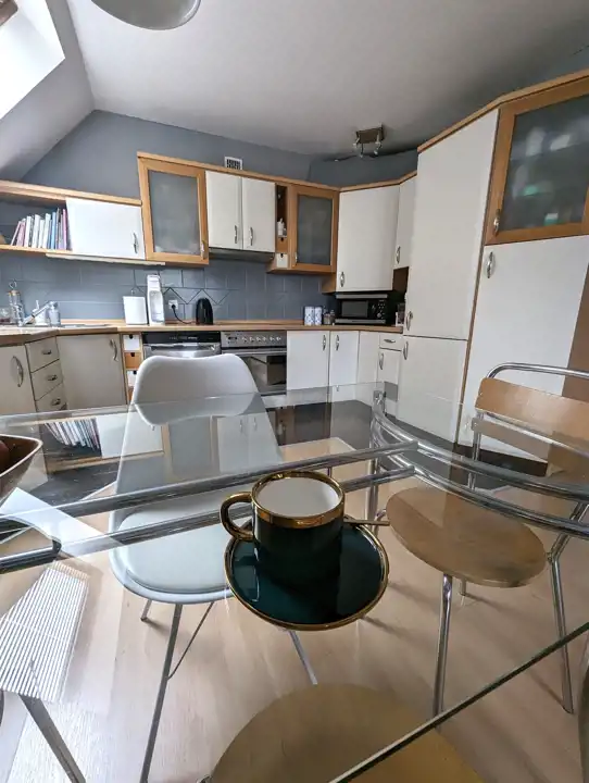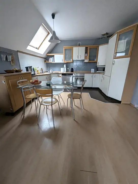 Jadalna (salon) wraz z aneksem kuchennym o pow. 23,10 m2. W pełni wyposażony aneks w sprzęt AGD (płyta indukcyjna, piekarnik, lodówka, zmywarka). Z wyjściem na loggię. Na wyposażeniu klimatyzacja. W kuchni częściowo ogrzewanie podłogowe.