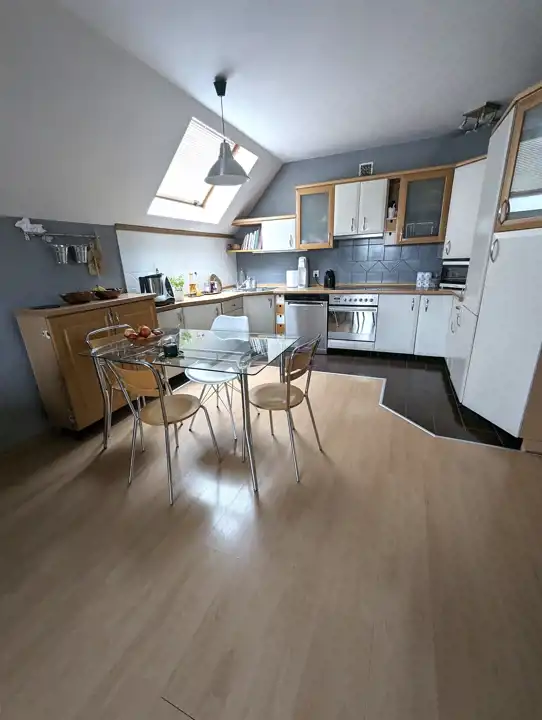 Jadalna (salon) wraz z aneksem kuchennym o pow. 23,10 m2. W pełni wyposażony aneks w sprzęt AGD (płyta indukcyjna, piekarnik, lodówka, zmywarka). Z wyjściem na loggię. Na wyposażeniu klimatyzacja. W kuchni częściowo ogrzewanie podłogowe.