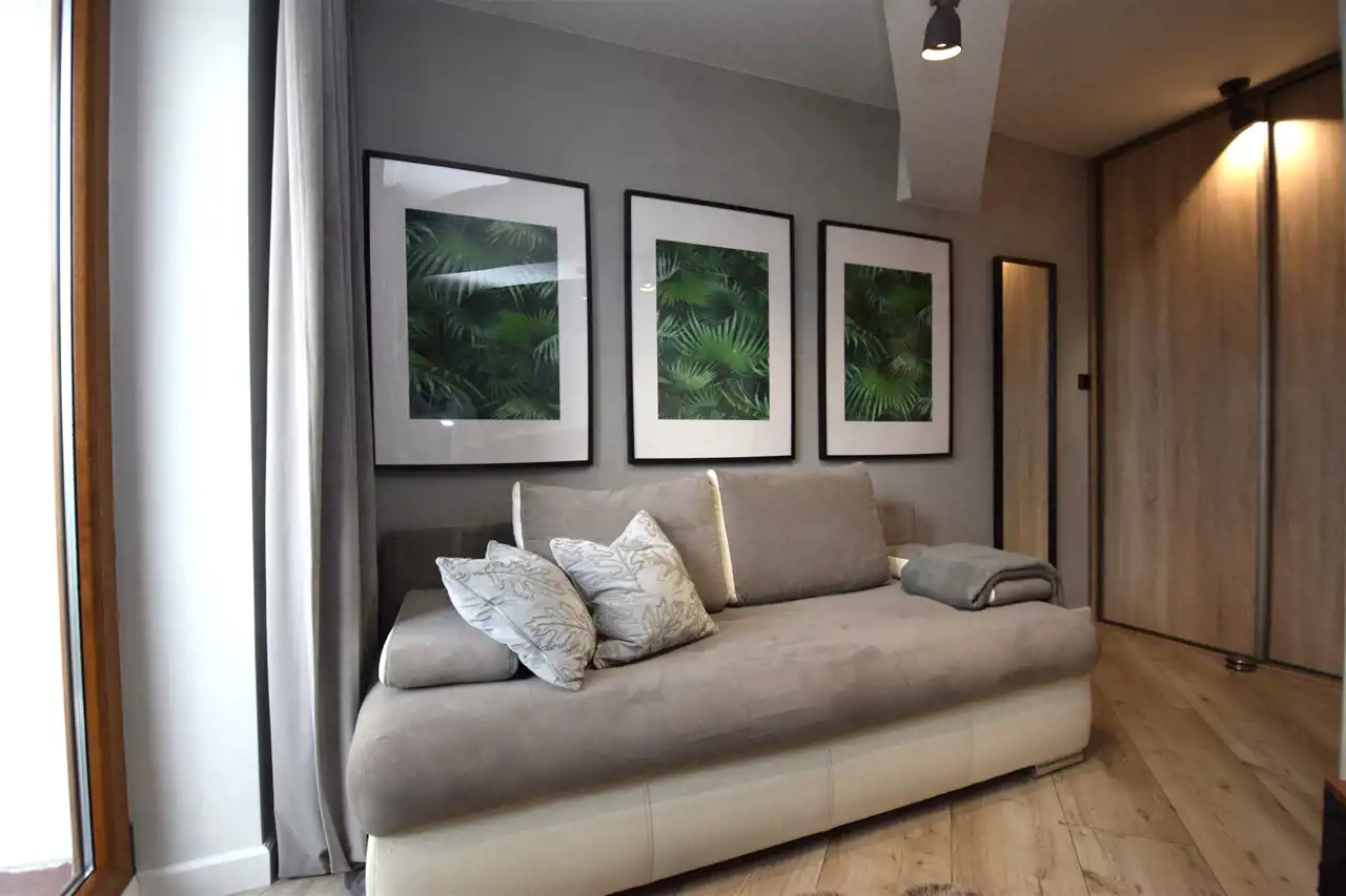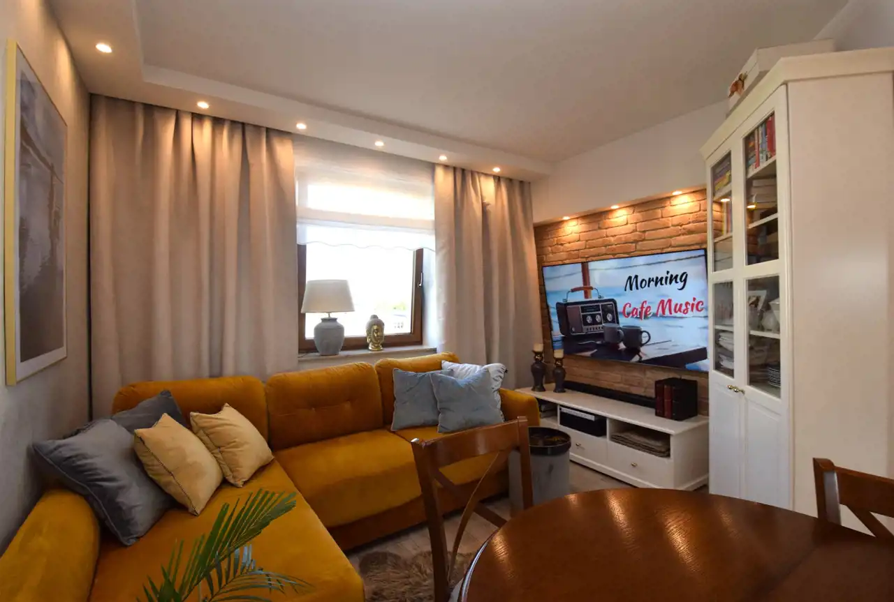 Przepięknie zaprojektowane wnętrze 3-pokojowego apartamentu, w którym każdy szczegół, detal ma znaczenie. Tynki strukturalne, cegła, panele, kamienny blat, okna w kolorze drewna, parapety, lustrzane szafy itd., itp. Fantastycznie dobrane oświetlenie.