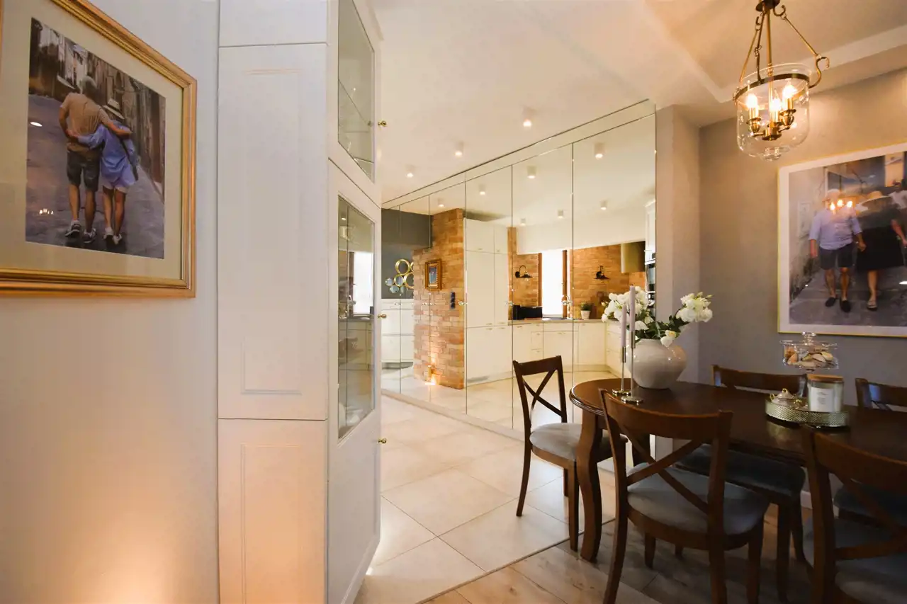 Przepięknie zaprojektowane wnętrze 3-pokojowego mieszkania, w którym każdy szczegół ma znaczenie. Tynki strukturalne, cegła, panele, kamienny blat, okna w kolorze drewna, parapety, lustrzane szafy. Fantastycznie dobrane oświetlenie.