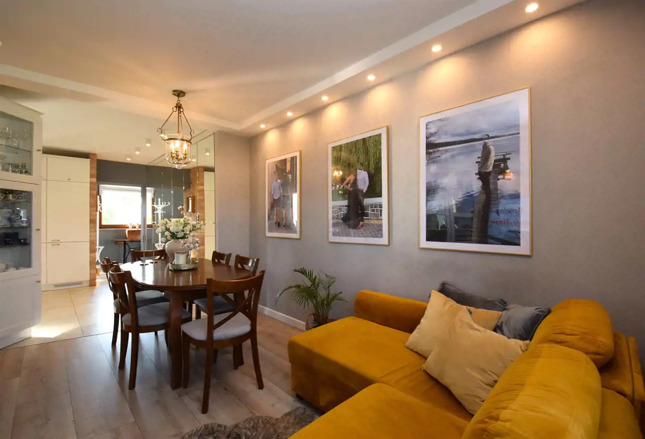 Przemyślany podział części dziennej od pokoi, w których każdy wyposażony jest w szafy (drzwi przesuwne).