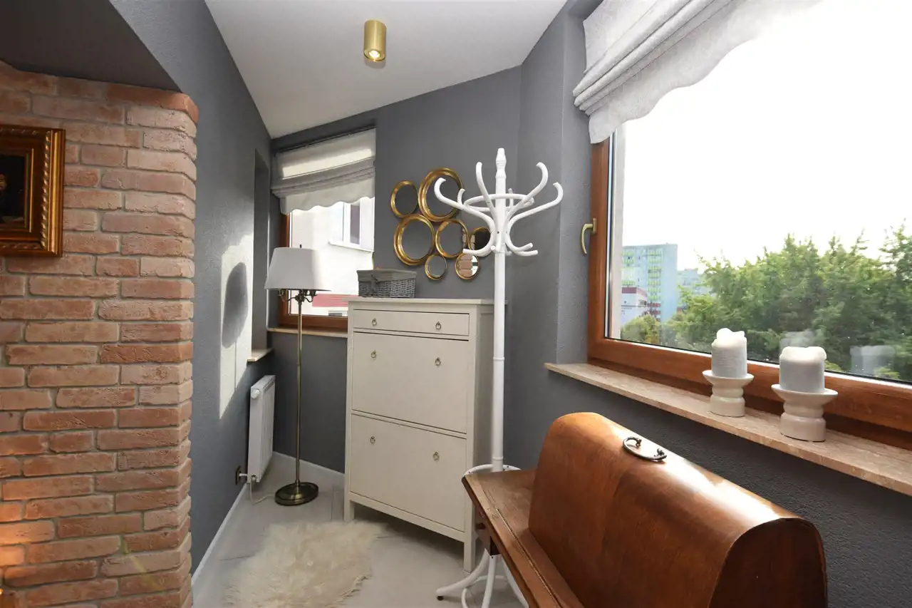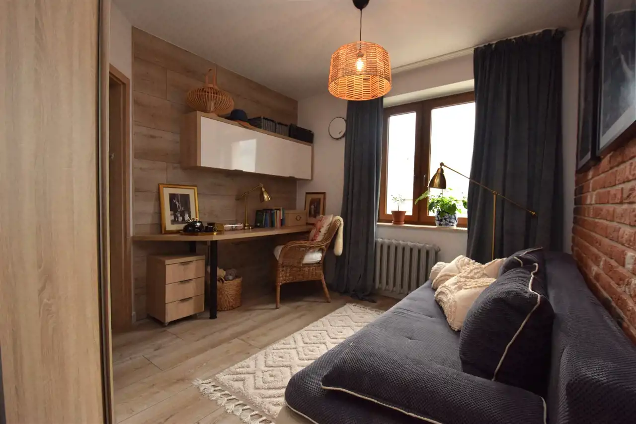 Przepięknie zaprojektowane wnętrze 3-pokojowego apartamentu, w którym każdy szczegół, detal ma znaczenie. Tynki strukturalne, cegła, panele, kamienny blat, okna w kolorze drewna, parapety, lustrzane szafy itd., itp. Fantastycznie dobrane oświetlenie.