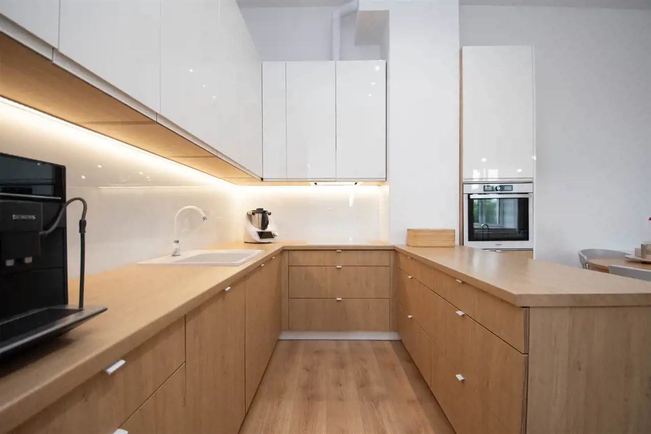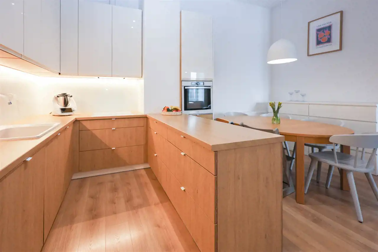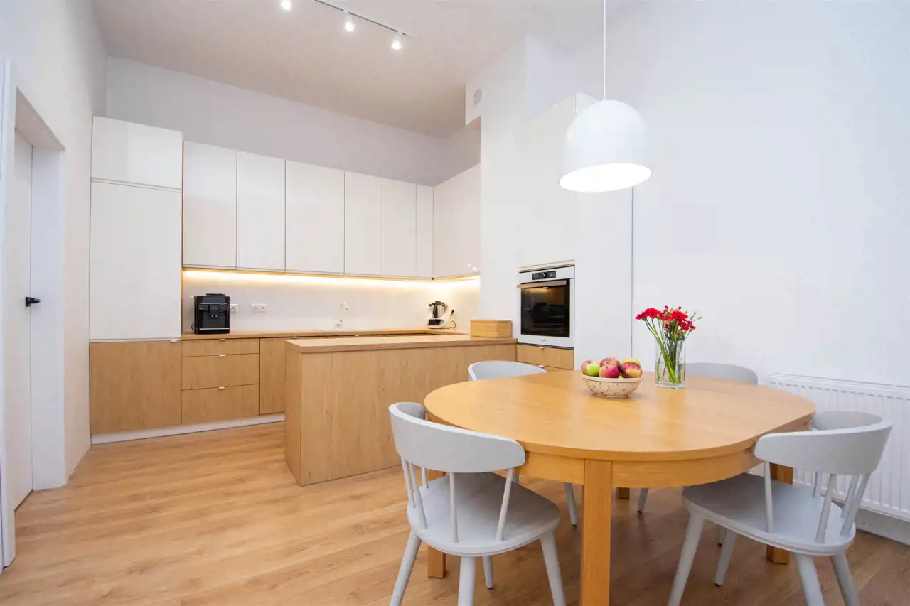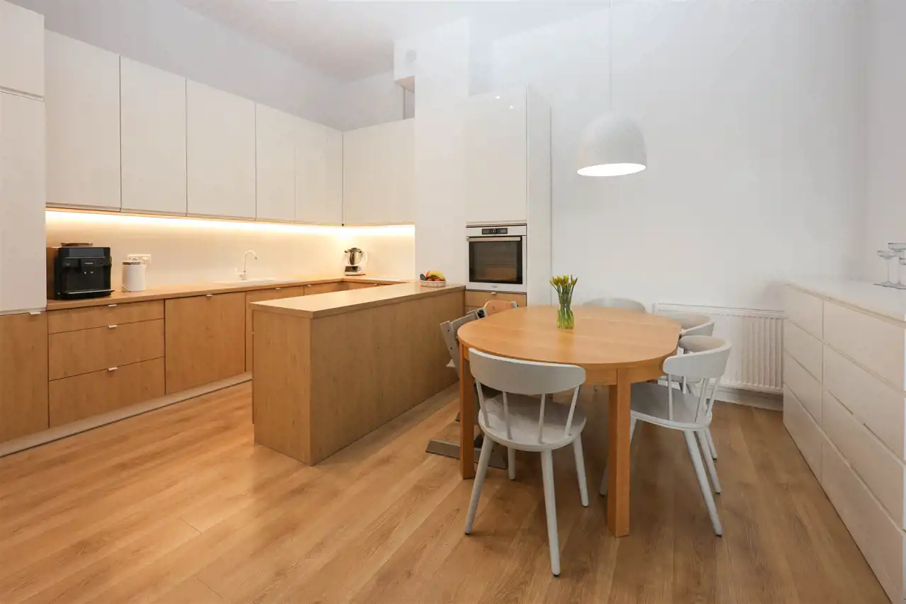 - Kuchnia: Nowoczesna, w pełni wyposażona, tworzy spójną całość z jadalnią i salonem.
