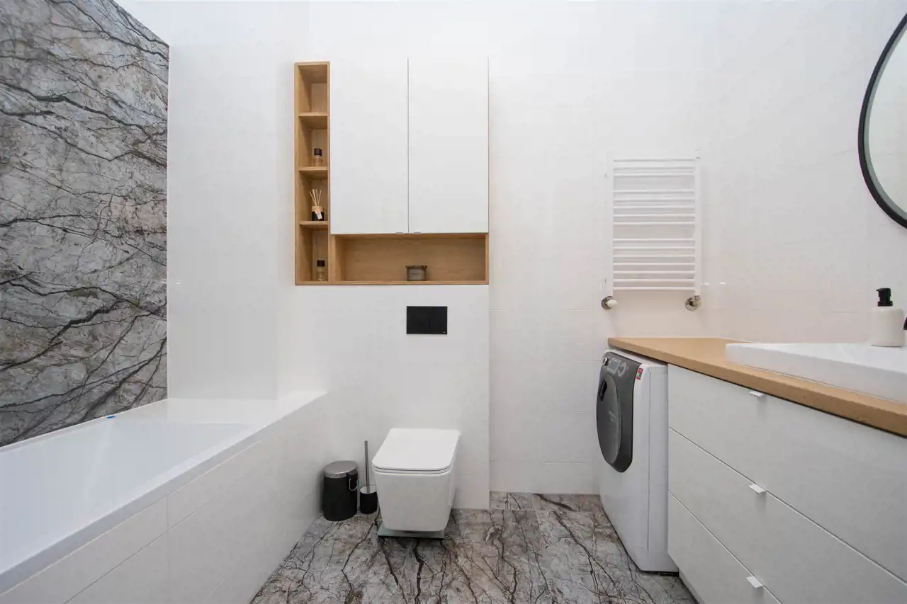 - Łazienka: Nowoczesna, z wanną i bardzo przestrzenna.