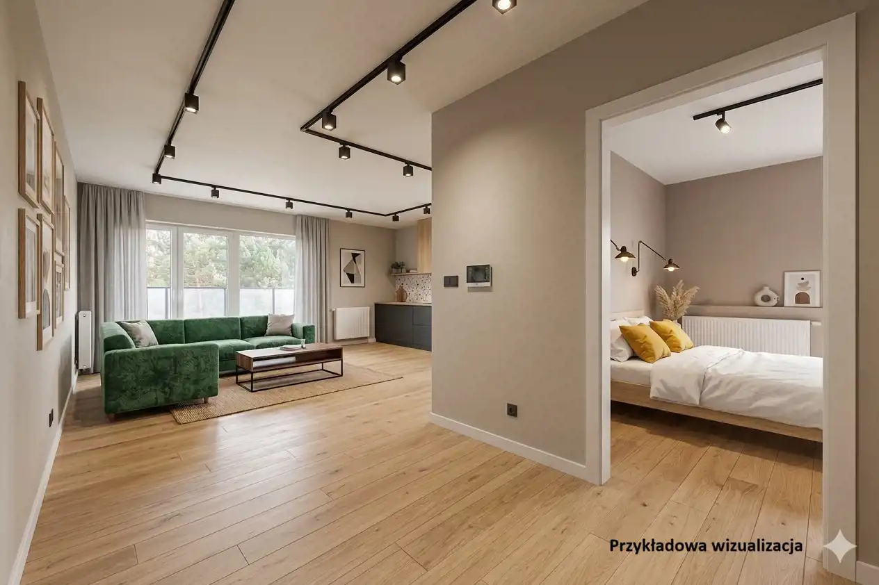 Prezentowane w ogłoszeniu wizualizacje mają charakter poglądowy i stanowią propozycję możliwej aranżacji wnętrza, ukazując potencjał nieruchomości.