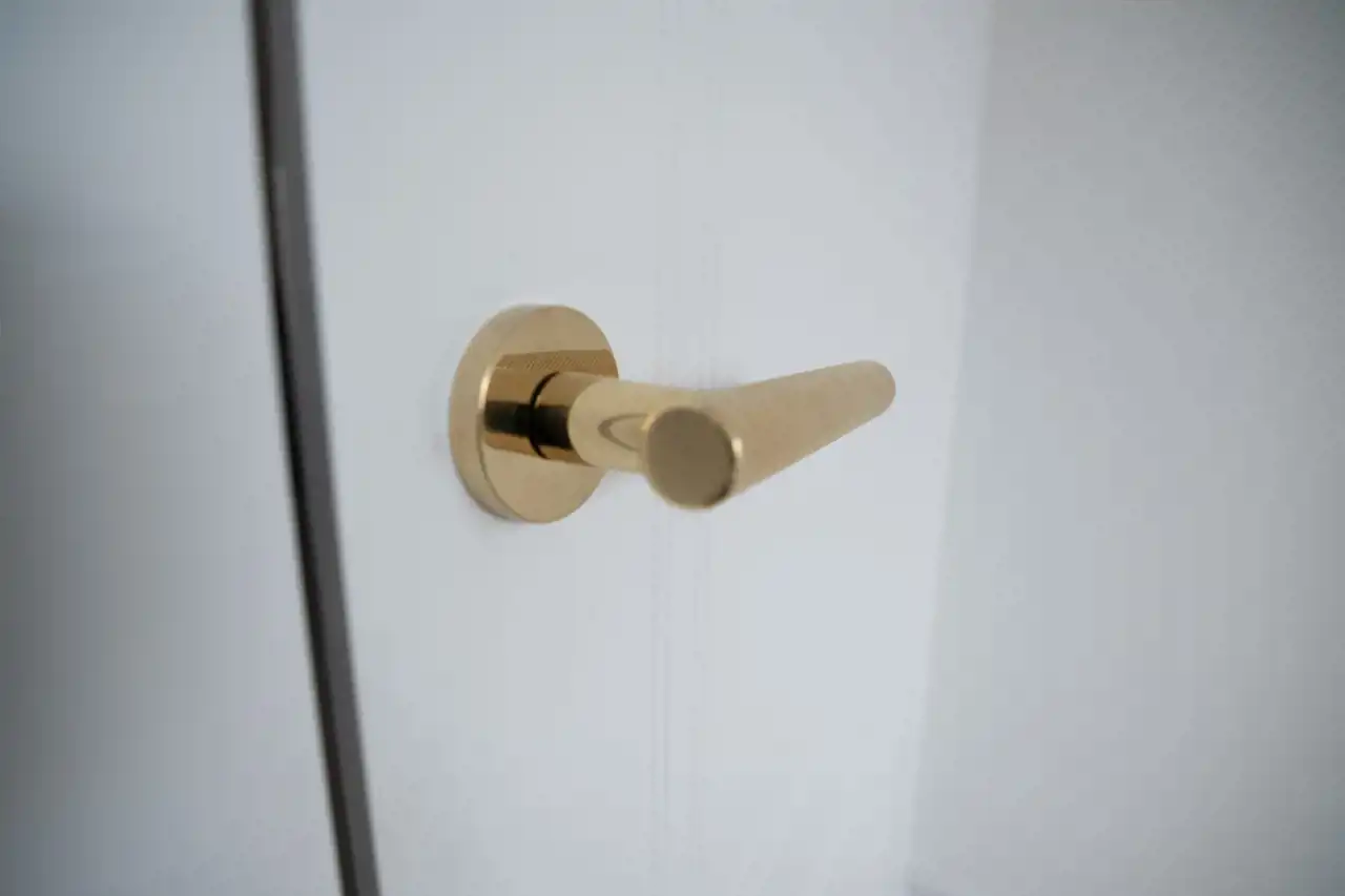 - Białe drzwi ze złotymi klamkami