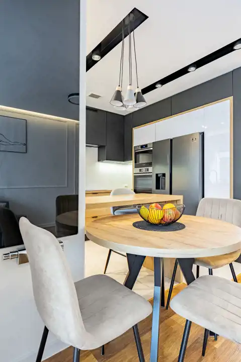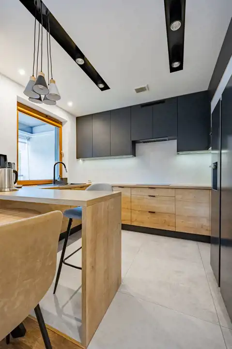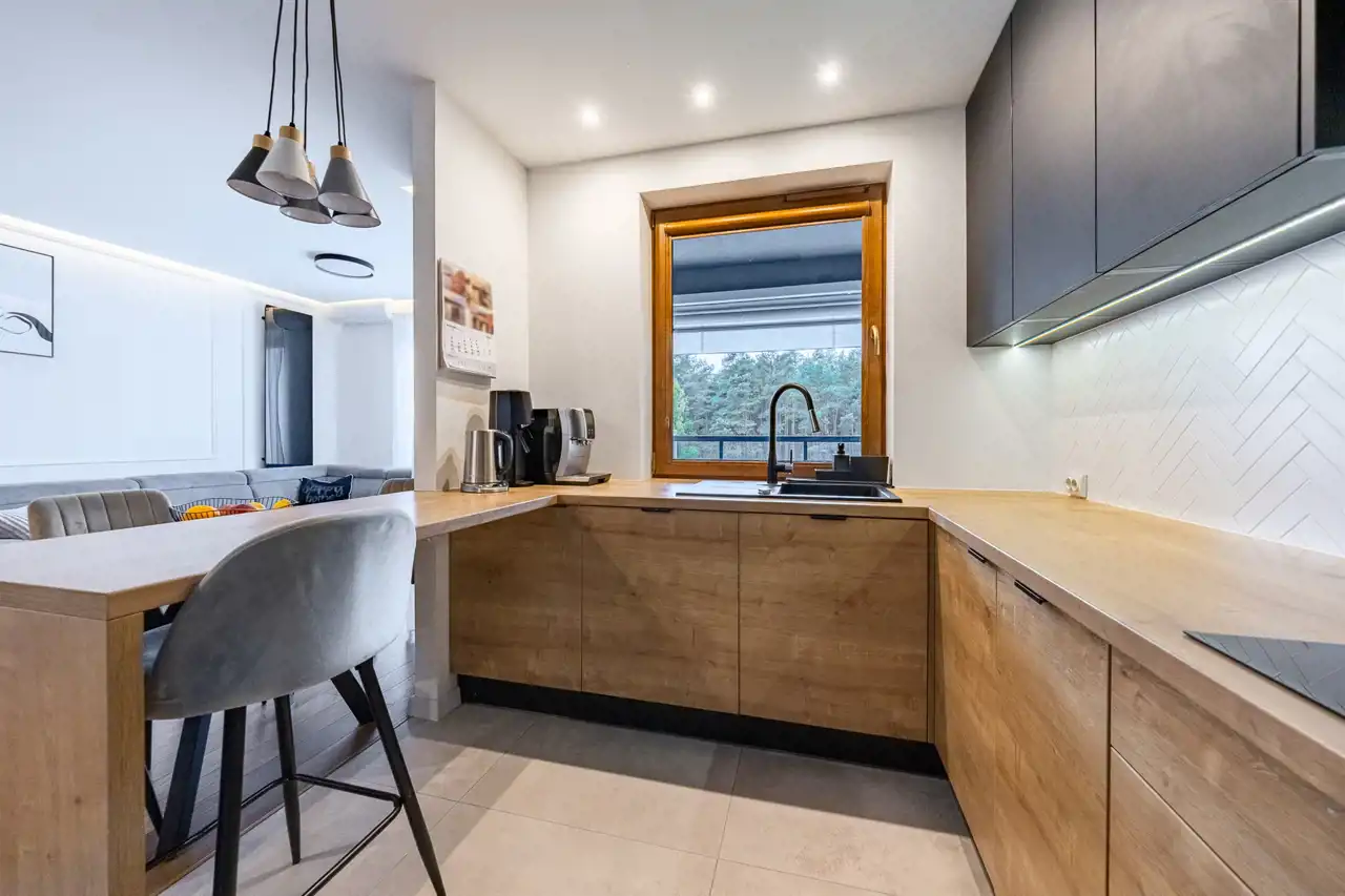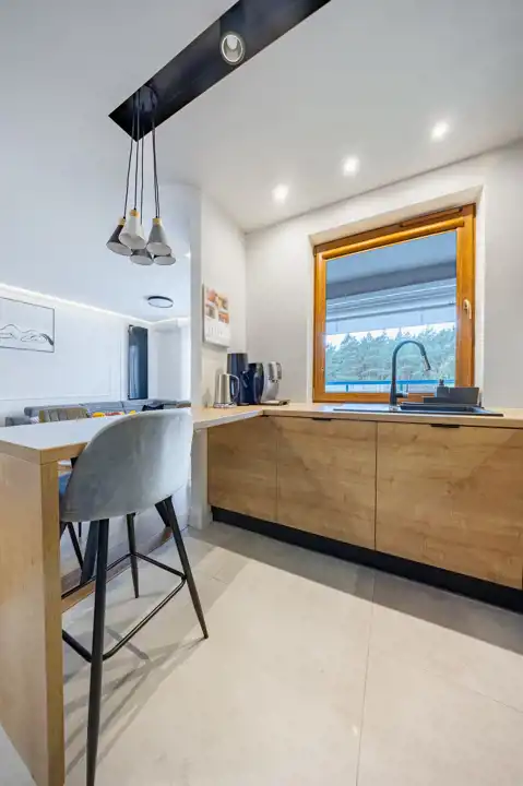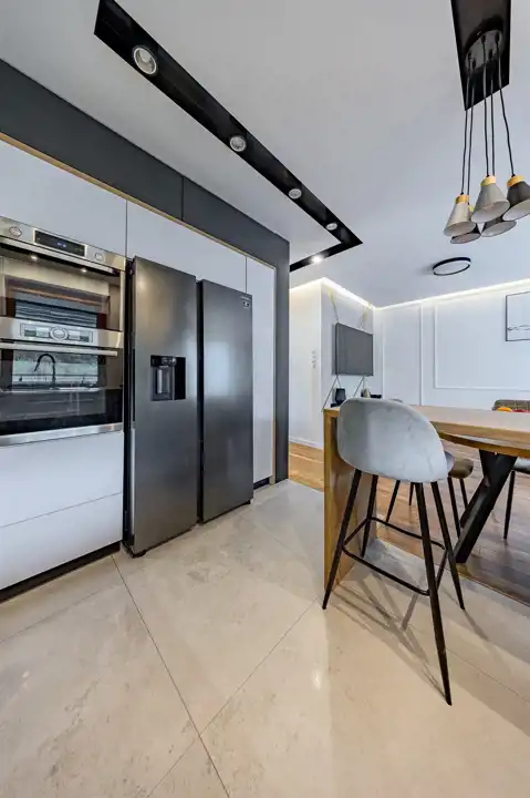 - Kuchnia o pow. 7 m2 wykonana z wysokiej jakości materiałów, wyposażona w sprzęt AGD marki Bosch – idealne połączenie nowoczesnego designu i niezawodności.