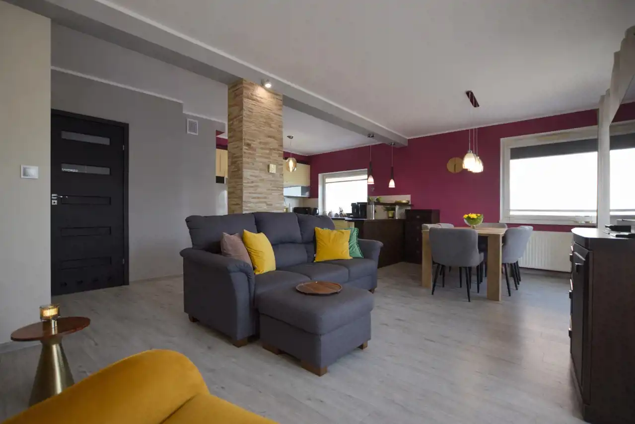 - stylowy salon z aneksem kuchennym o pow. 34,4 m2 w pełni wyposażonym w sprzęt AGD