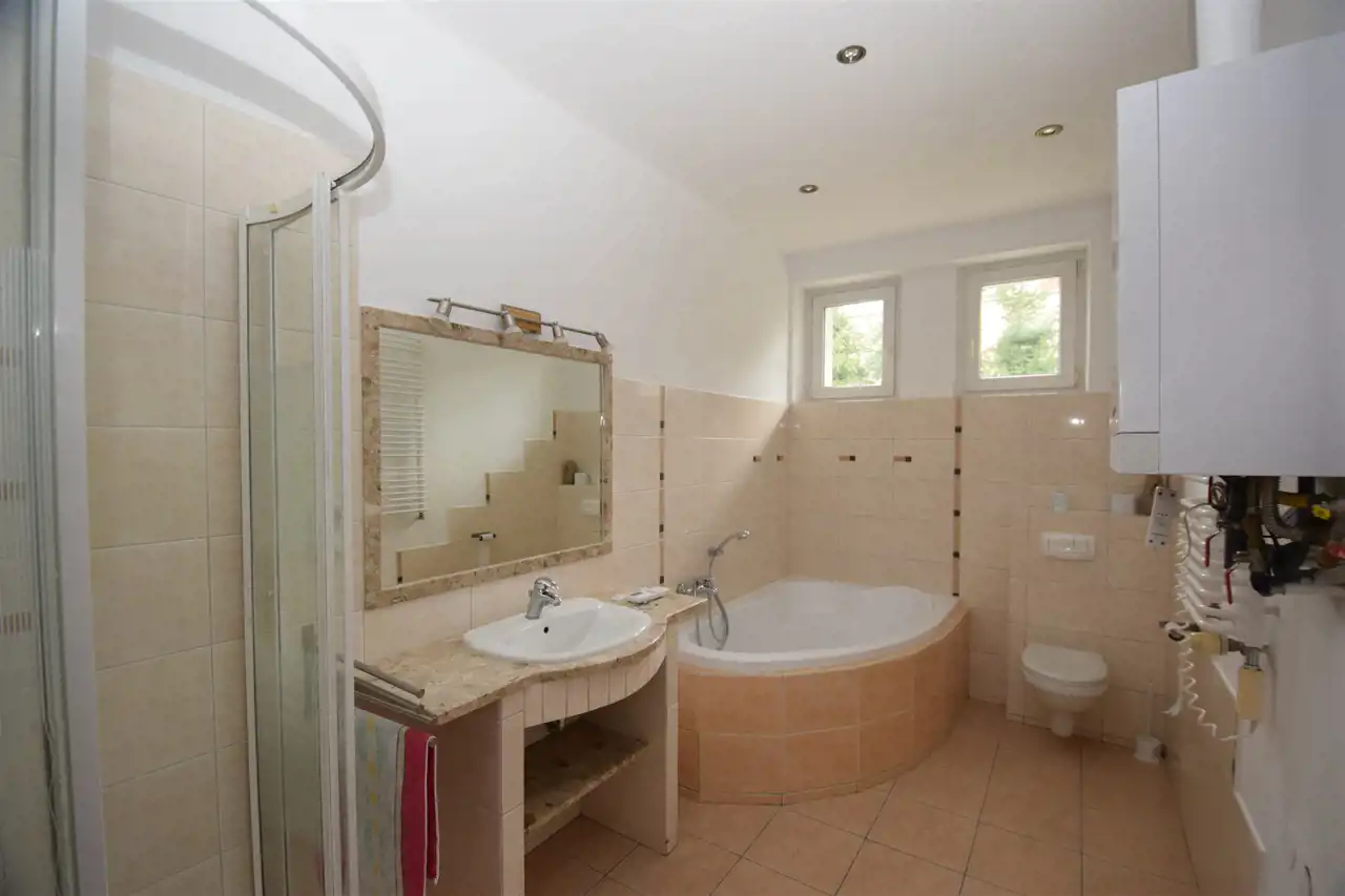 Łazienka razem z wc o pow. ok. 9m2. Łazienka wyposażona w wannę i natrysk. Łazienka jasna, z oknem