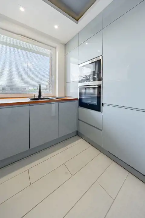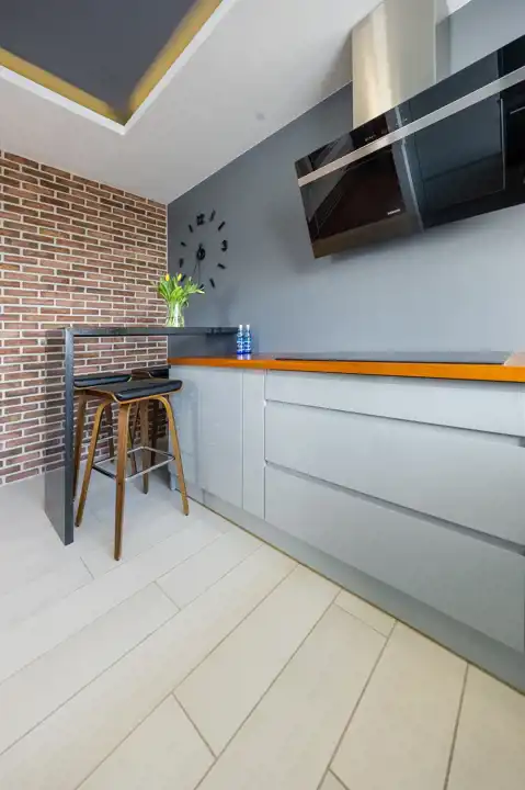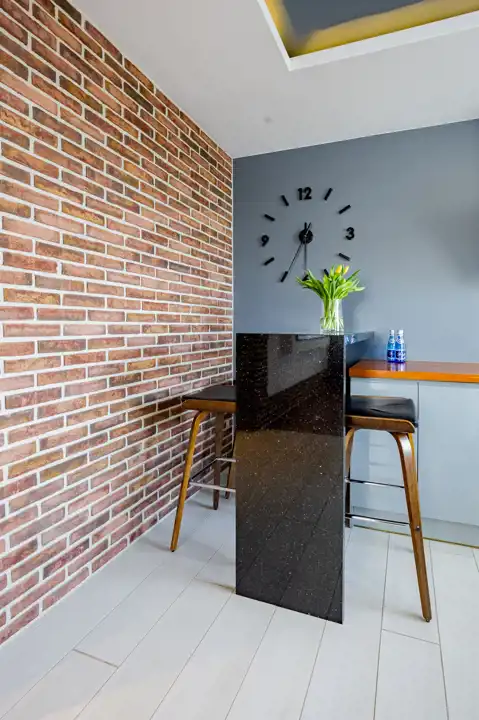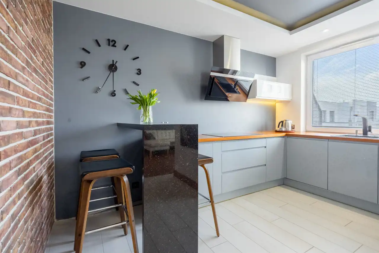 Nowoczesna kuchnia z oknem, pod zabudowę, wyposażona w sprzęt AGD, który pozostaje w cenie, to idealne miejsce dla miłośników gotowania. W kuchni znajduje się również wygodny stolik z hokerami, tworząc przytulne miejsce na szybkie posiłki i poranne kawy. Ceglane akcenty w kuchni dodają wnętrzu niepowtarzalnego charakteru.
