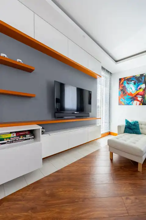 Wnętrze tego mieszkania zachwyca przestronnością i funkcjonalnością. Salon wykończony w eleganckim stylu z użyciem cegły, tworzy idealne miejsce na wspólne spędzanie czasu z rodziną i przyjaciółmi.