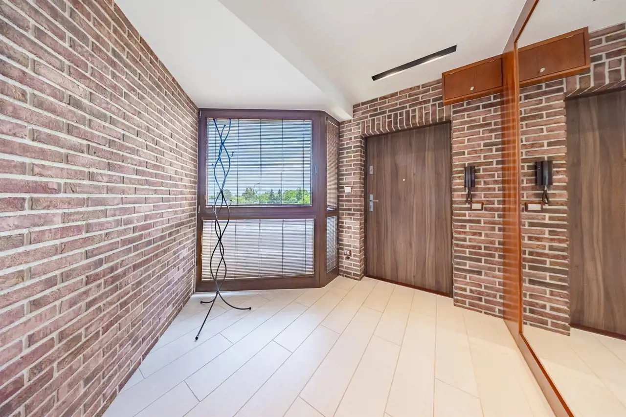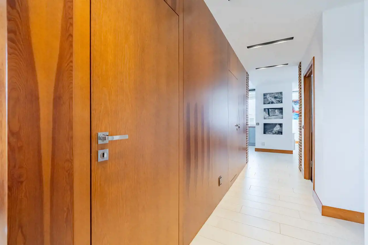 Przestronny korytarz, wykończony cegłą, tworzy spójny klimat z salonem i kuchnią co dodaje wnętrzu elegancji. Lustra w korytarzu optycznie powiększają przestrzeń, zapewniając jednocześnie praktyczne rozwiązanie. Dodatkowe miejsce na przechowywanie w korytarzu zwiększa funkcjonalność mieszkania.