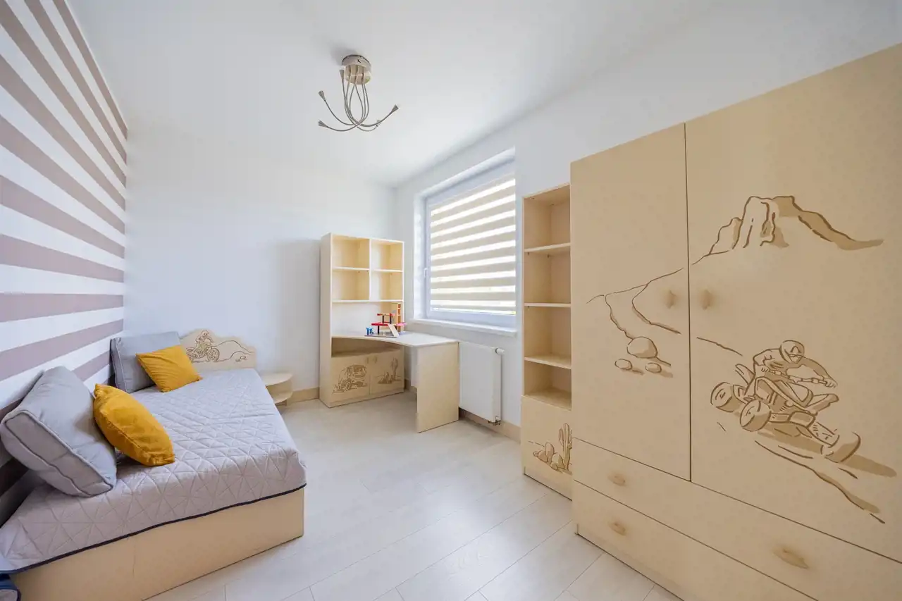 Dwa pokoje, funkcjonalne i przytulne, doskonale sprawdzą się jako sypialnia, pokój dziecięcy lub gabinet. W sypialni znajduje się zabudowa szaf i półek, która zapewnia dużo miejsca do przechowywania. Łazienka wyposażona w nowoczesną kabinę prysznicową, wannę oraz WC została zaprojektowana z myślą o komforcie i wygodzie. Przestronny korytarz zapewnia swobodę poruszania się i dodatkowe miejsce na przechowywanie, a praktyczny schowek pozwala na przechowywanie rzadziej używanych przedmiotów.