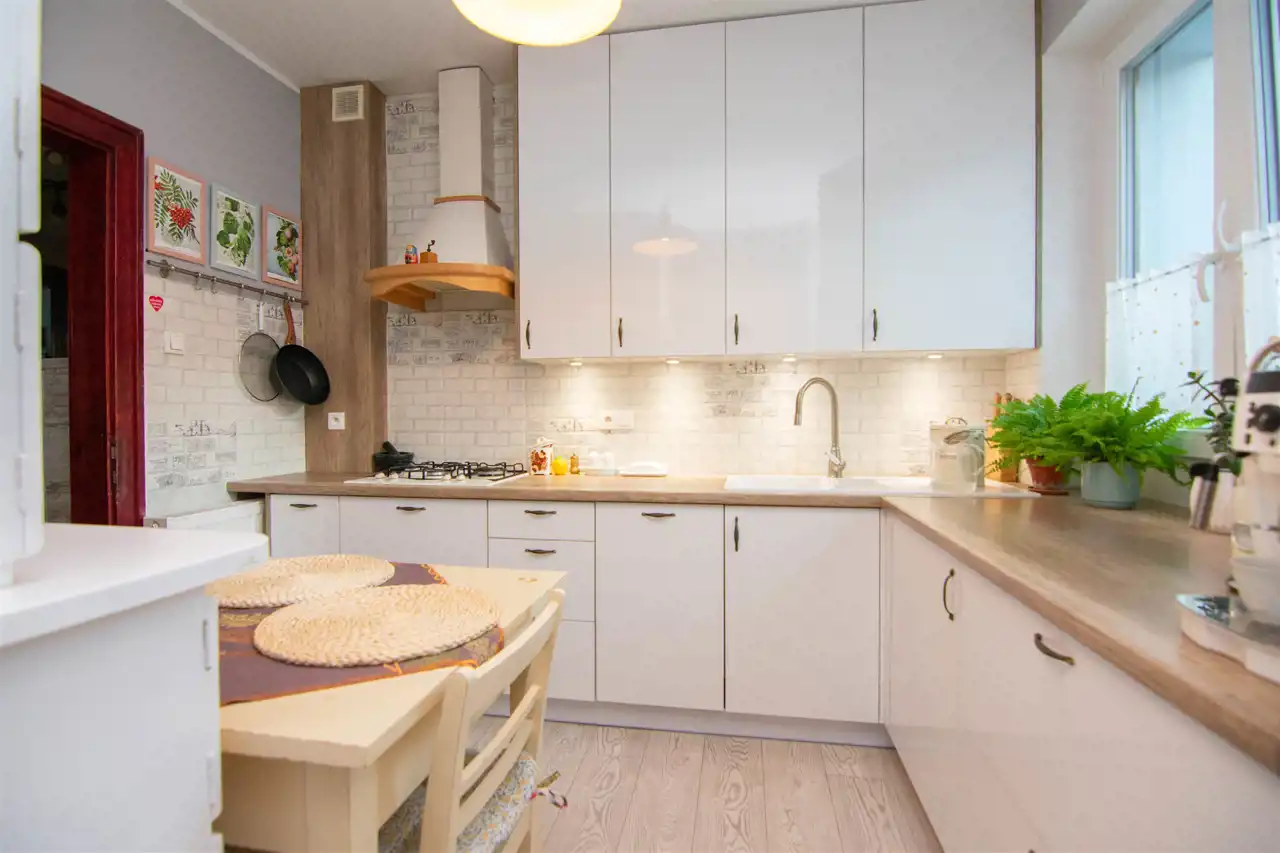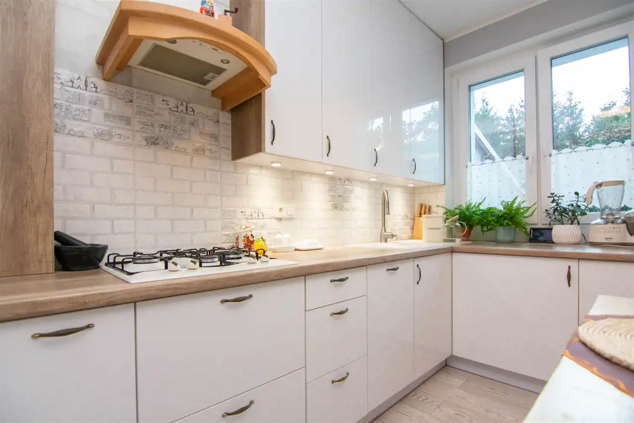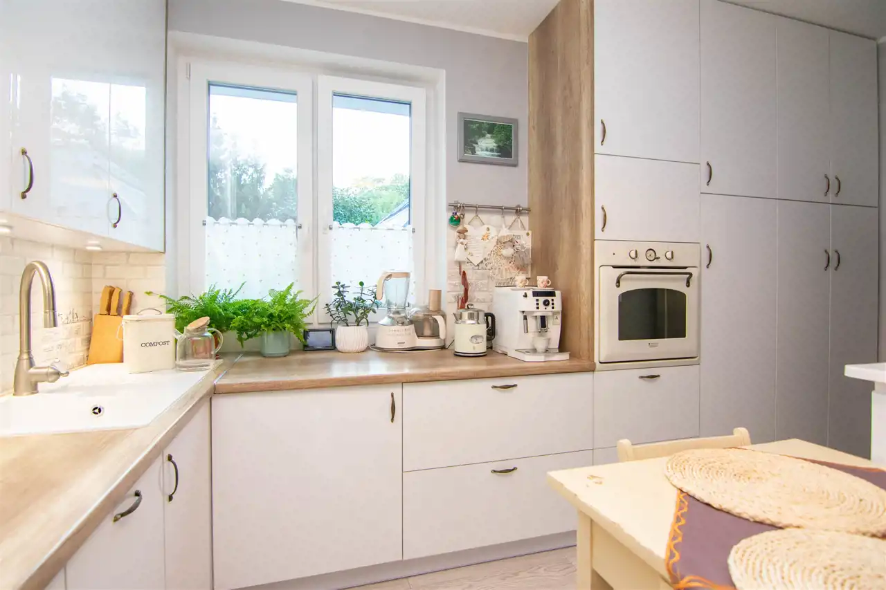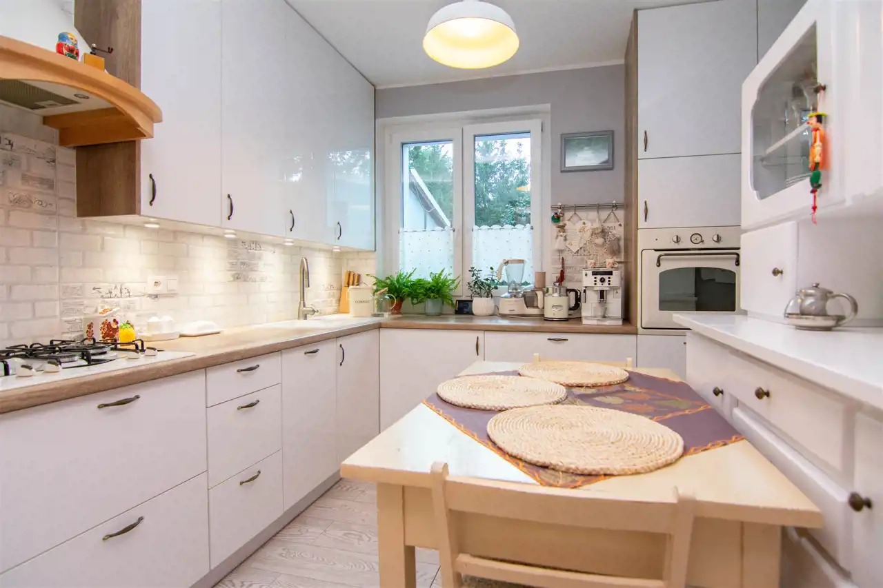 Kuchnia o powierzchni 14,9 m². Nowoczesna zabudowa kuchenna została uzupełniona odrestaurowanym kredensem, który dodaje wnętrzu niepowtarzalnego uroku.