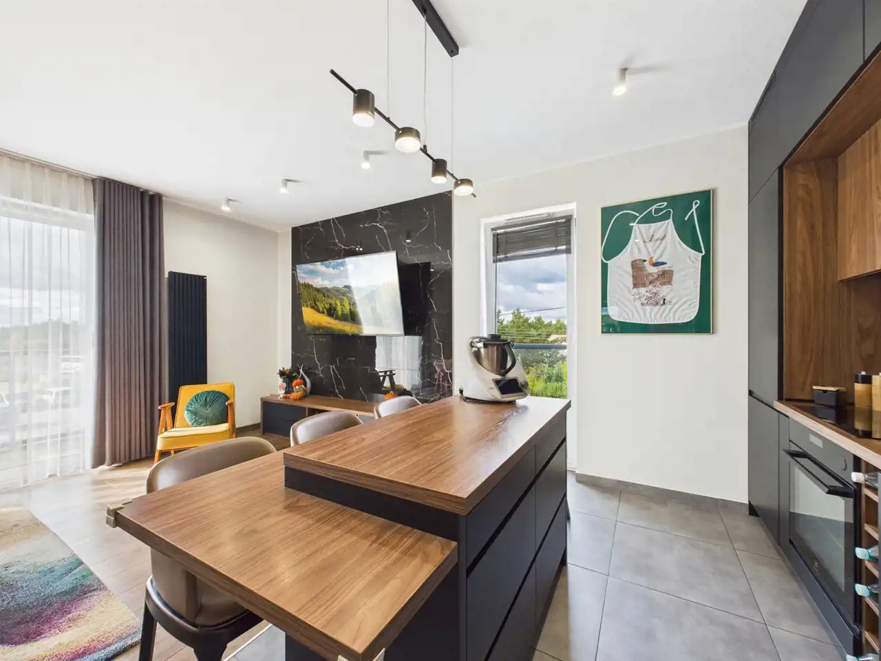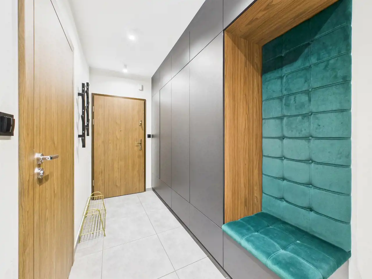 Mieszkanie jest w pełni wyposażone – gotowe do zamieszkania od zaraz. W kuchni znajdziesz sprzęt AGD wysokiej klasy: zmywarkę, lodówkę, piekarnik, płytę grzewczą.