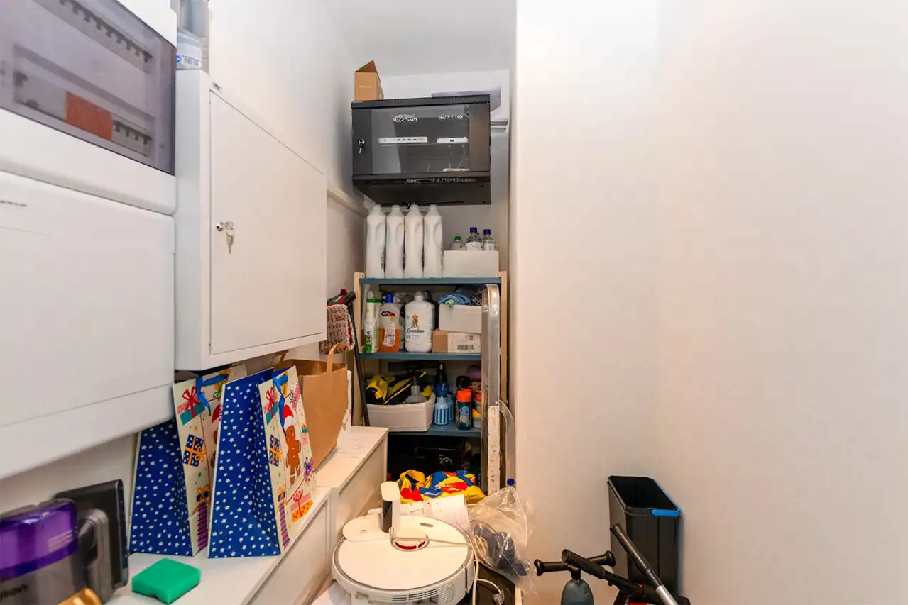 - Pomieszczenie gospodarcze, w którym znajduje się: węzeł cieplny, rozdzielnia prądu, sterowania do smarthome, światłowód, regały.