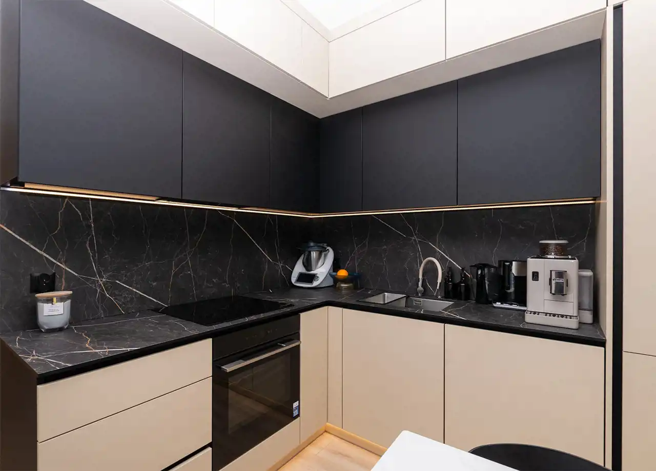 - Kuchnia wyposażona wysokiej jakości sprzęt AGD firmy Bosch (płyta indukcyjna, lodówko-zamrażalka szerokości 70cm, piekarnik z funkcją Airfryer, pochłaniacz, młynek na odpady firmy TEKA), meble na wymiar z frontami antyfinger firmy RARO, blaty kuchenne z konglomeratu firmy RARO, elegancji rozkładany stół ceramiczny wraz z krzesłami.