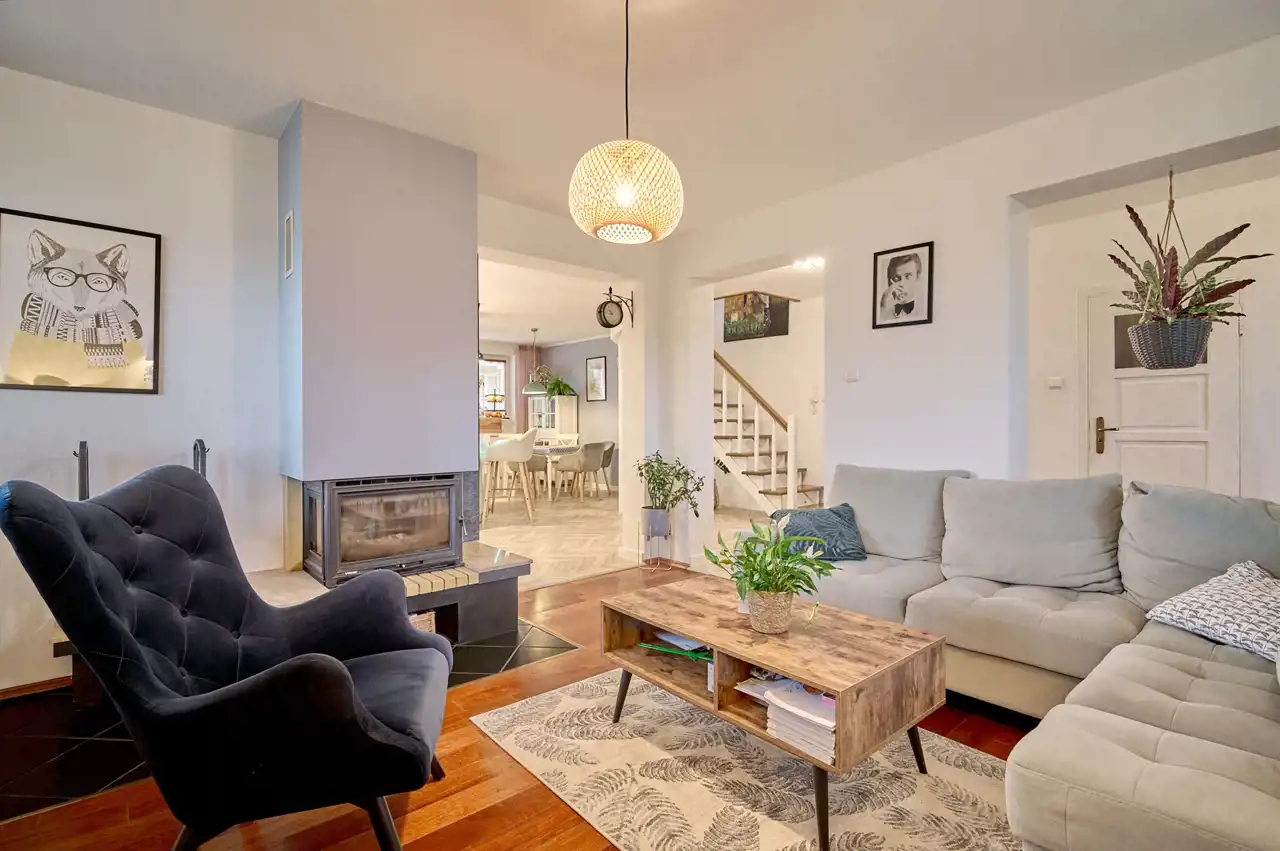 W salonie znajduje się kominek panoramiczny (3 szyby).