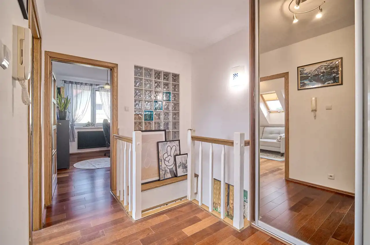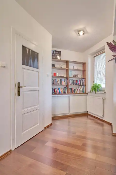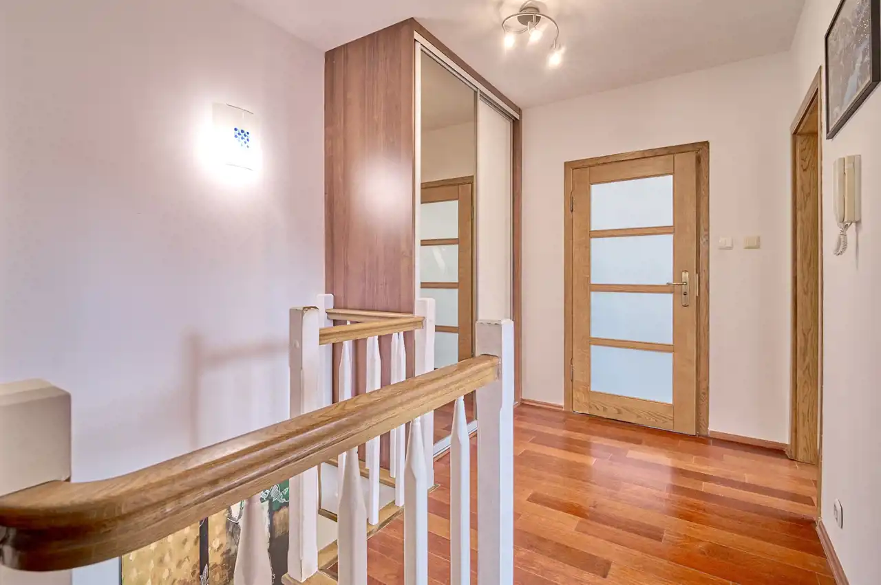 Na piętrze i w gabinecie zabudowane szafy (w cenie).