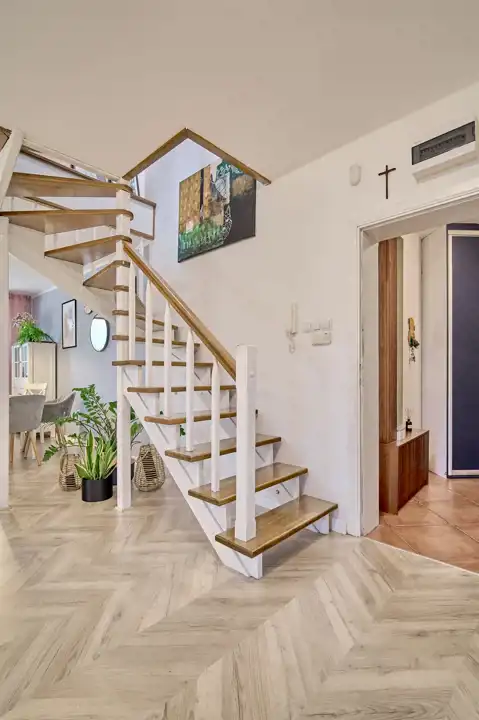 Przedpokoje, hol, eleganckie schody - wszystko zaprojektowane w sposób by wykorzystać przestrzeń użytkową,