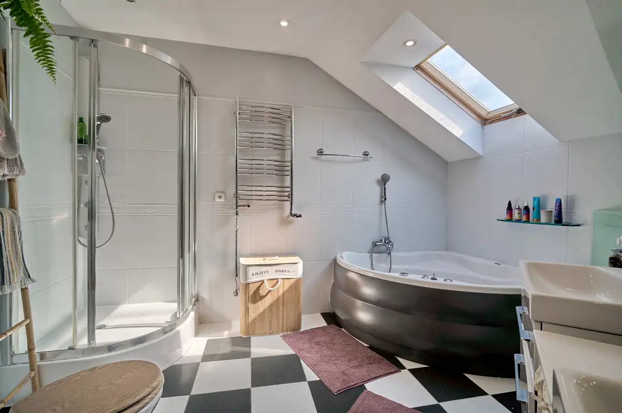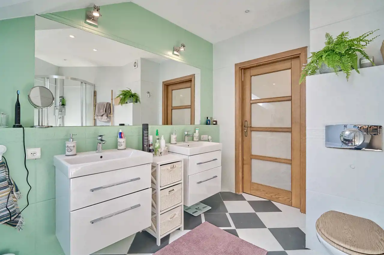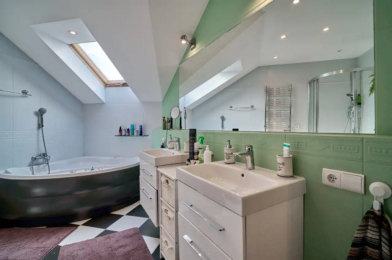 narożna wanna z hydromasażem, prysznic, 2 umywalki, toaleta typu Geberit.