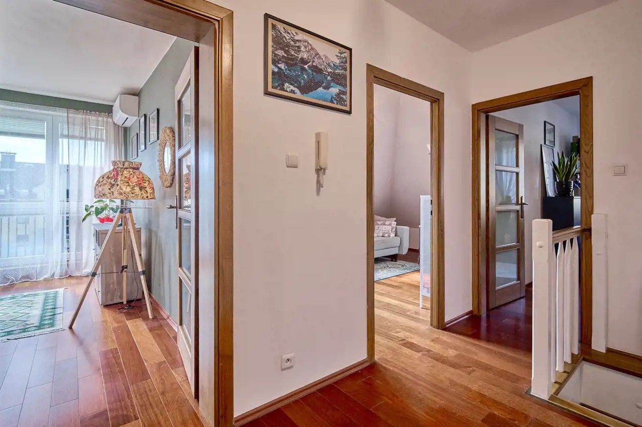 Ta dwupoziomowa nieruchomość o powierzchni 109,5 m2 składa się z 4 pokoi, kuchni, 2 łazienek, przedpokoju.