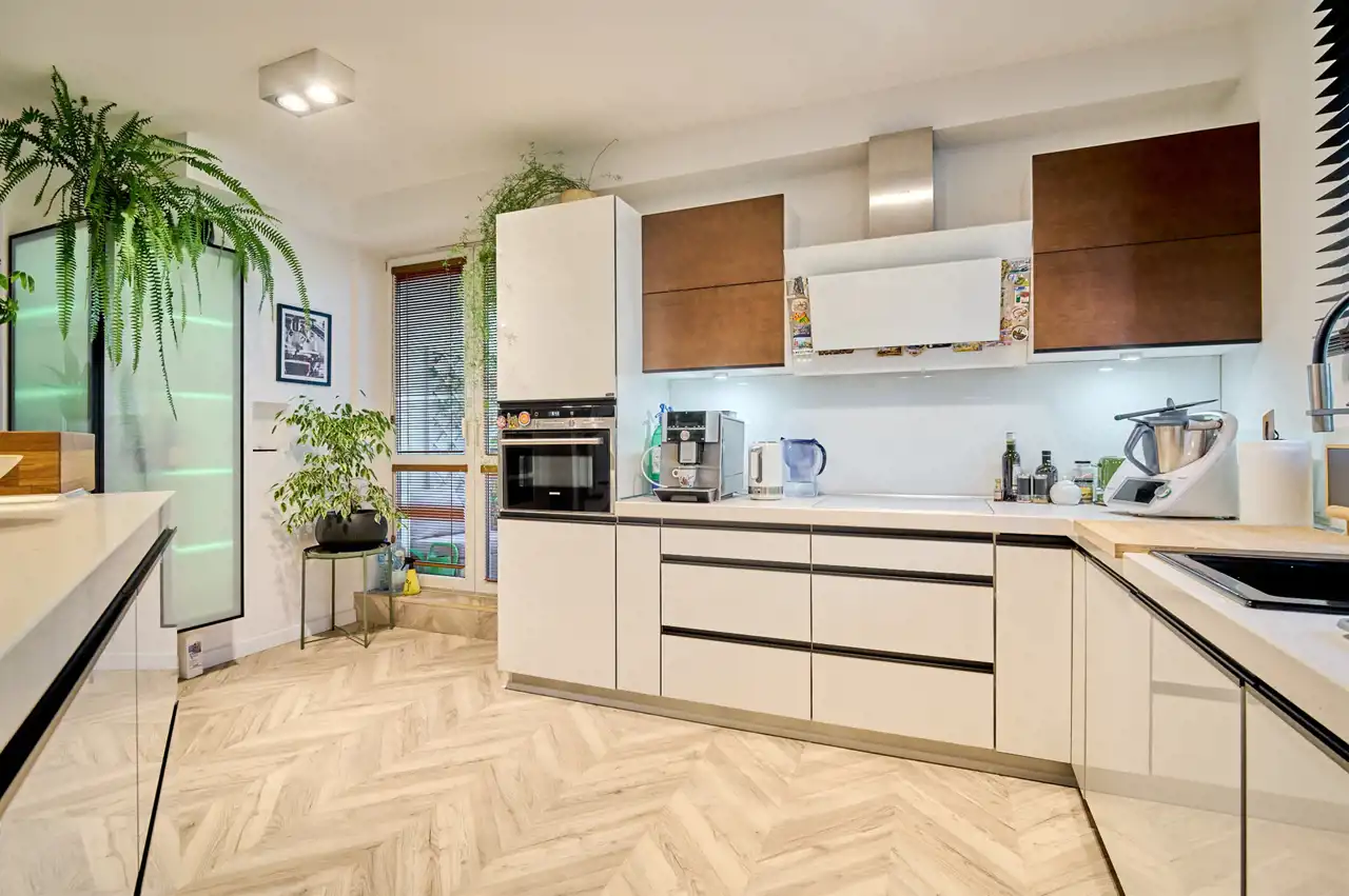 Meble w zabudowie z dużą ilością szuflad (systemy BLUM, szafki cargo), AGD renomowanych marek: lodówka w zabudowie, zmywarka Siemens, piekarnik z funkcją mikrofali Siemens, płyta grzewcza Bosch, okap Bosch.