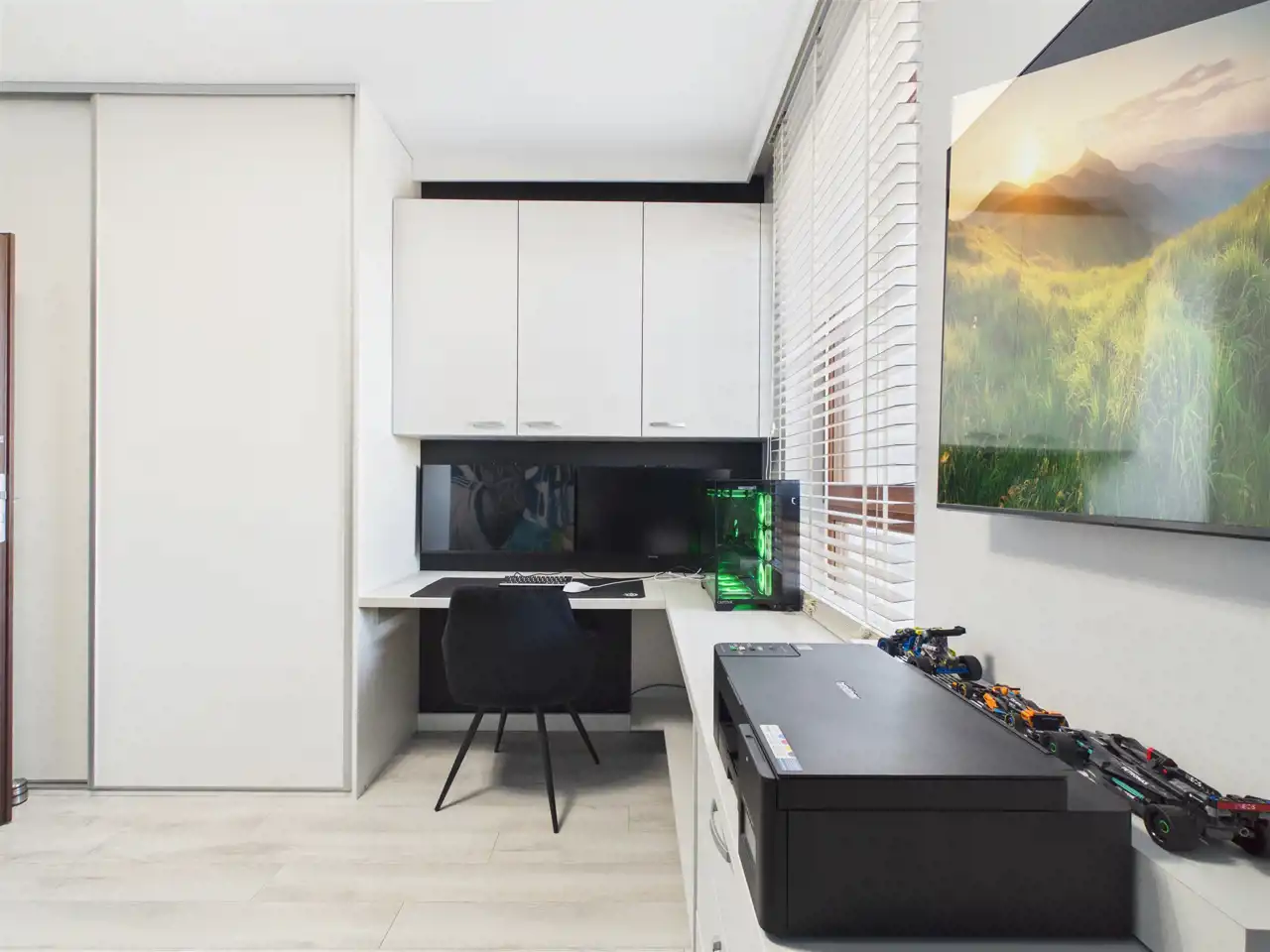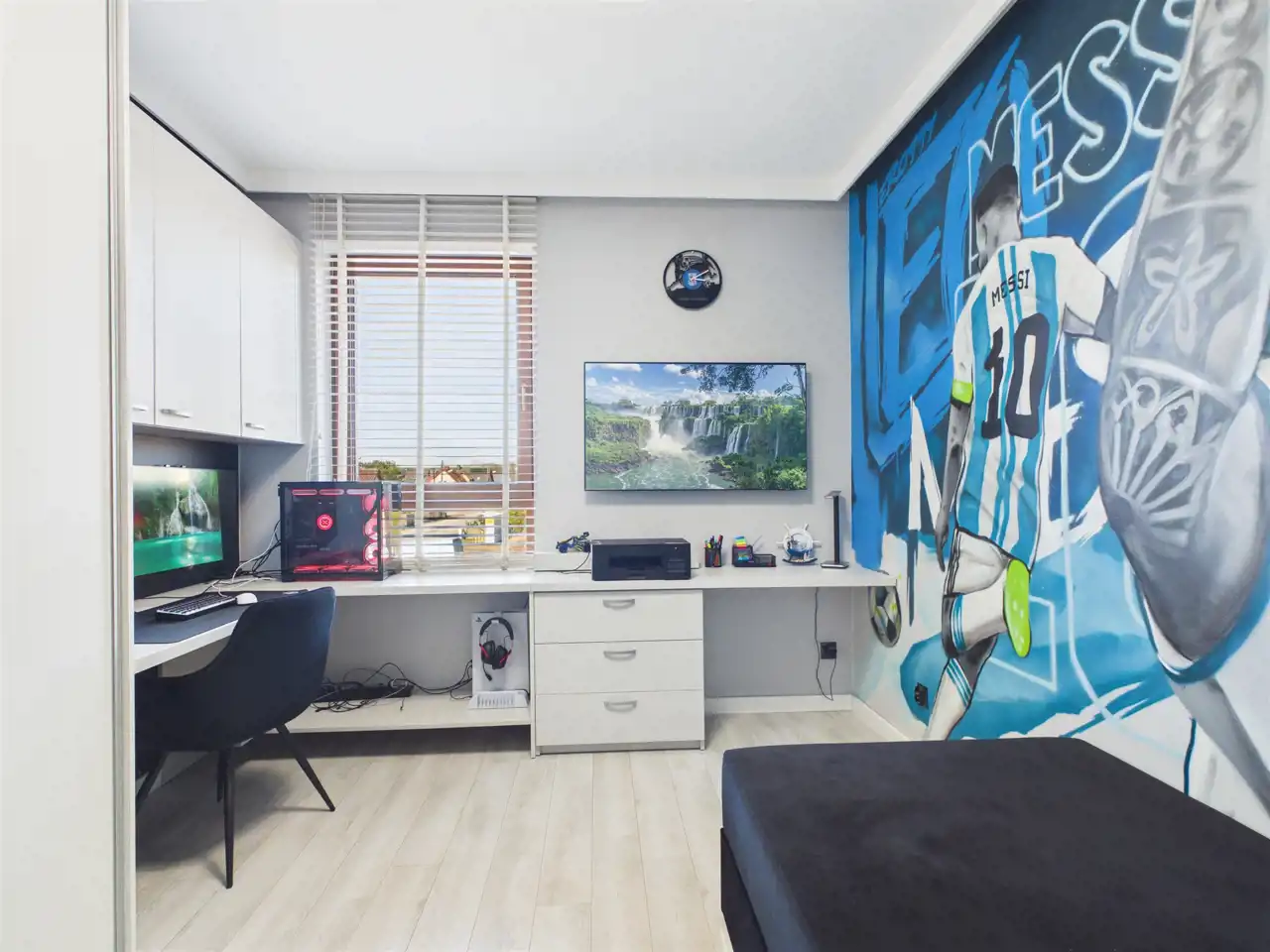 W sypialni przewidziano miejsce na dużą szafę w zabudowie, a w pokoju dziecka jest już wbudowana pojemna zabudowa składająca się z szafy oraz dwóch biurek i regału.