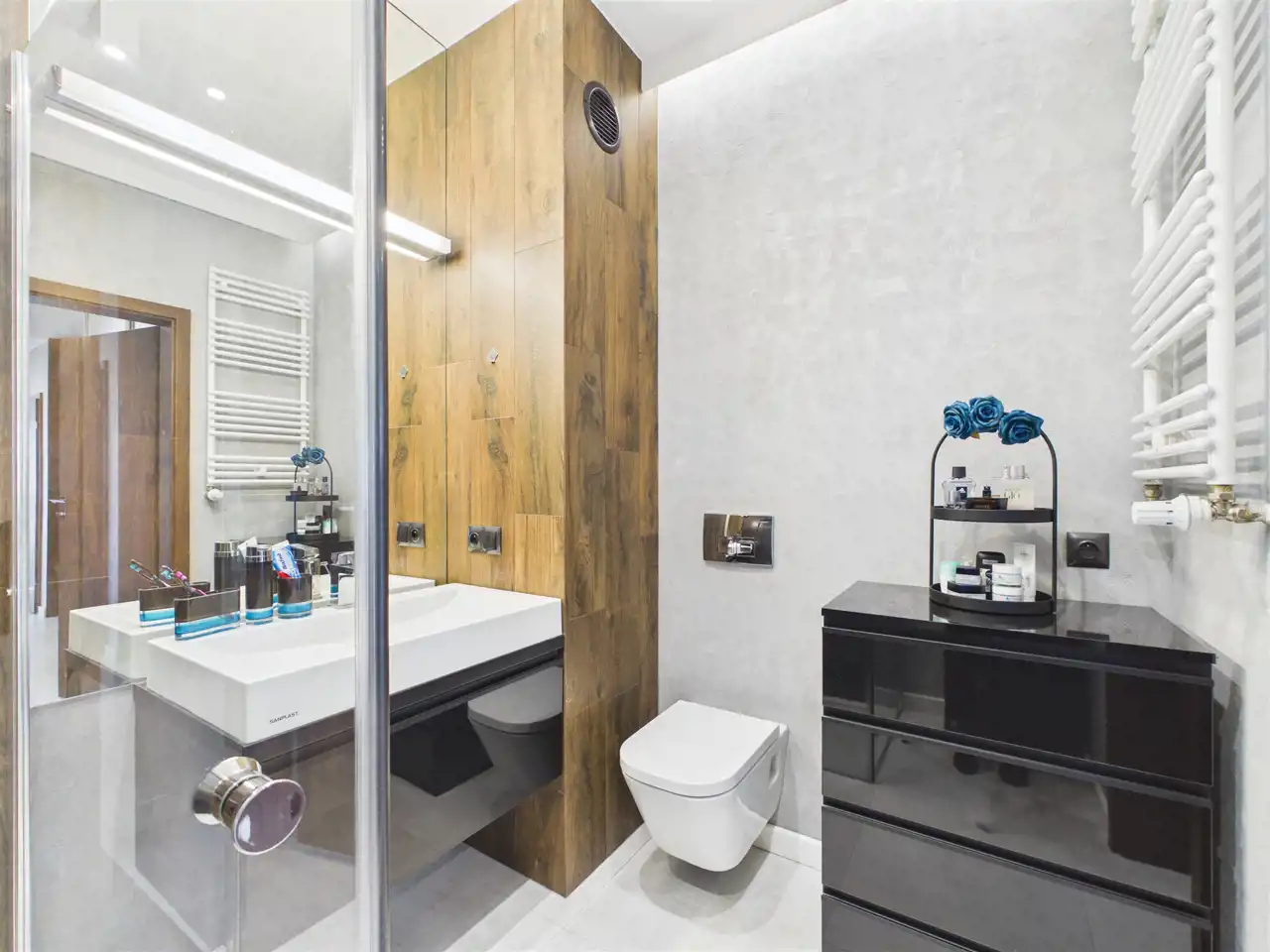 Mieszkanie jest ekonomiczne, wykończone ze smakiem, w bloku z 2017 roku, wyposażonym w cichobieżną windę, zjeżdżającą do poziomu piwnic.