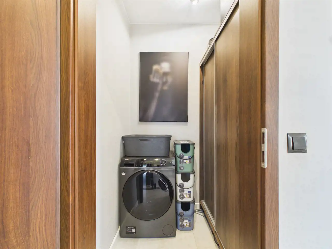 Pomieszczenie gospodarcze mieści dużą szafę, a także pralko-suszarkę.