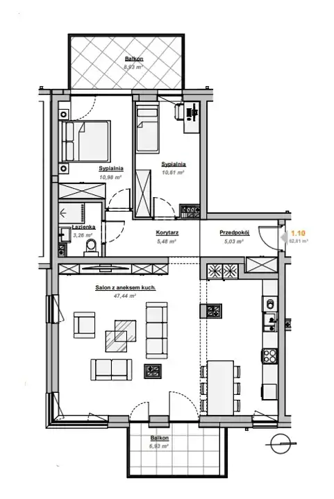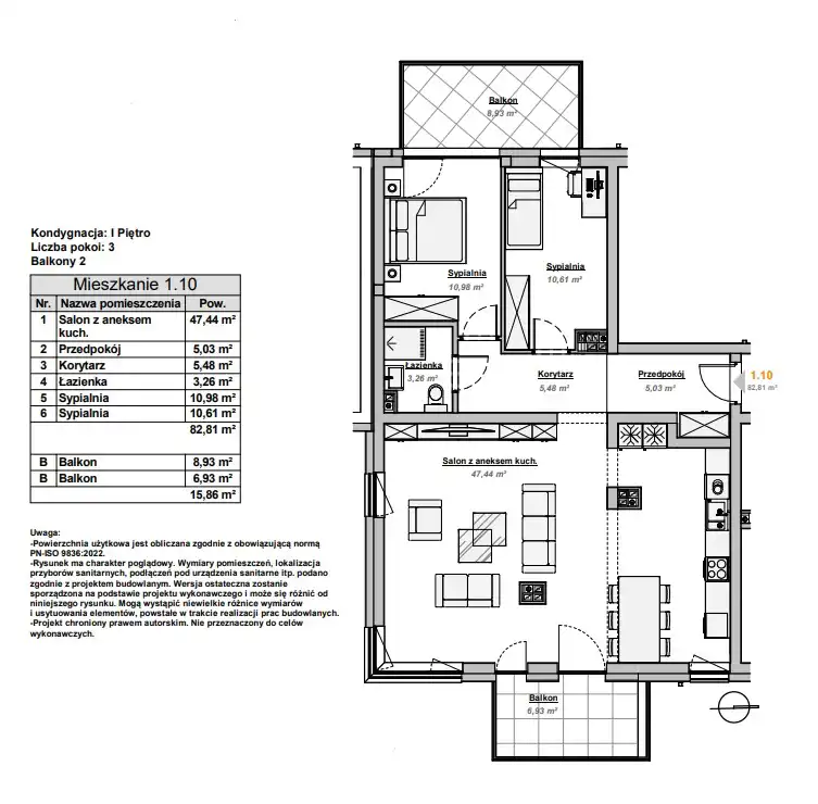 Apartament o powierzchni aż 82,81 m2 składa się z przestronnego salonu z aneksem kuchennym, 3 sypialni, łazienki oraz przedpokoju.