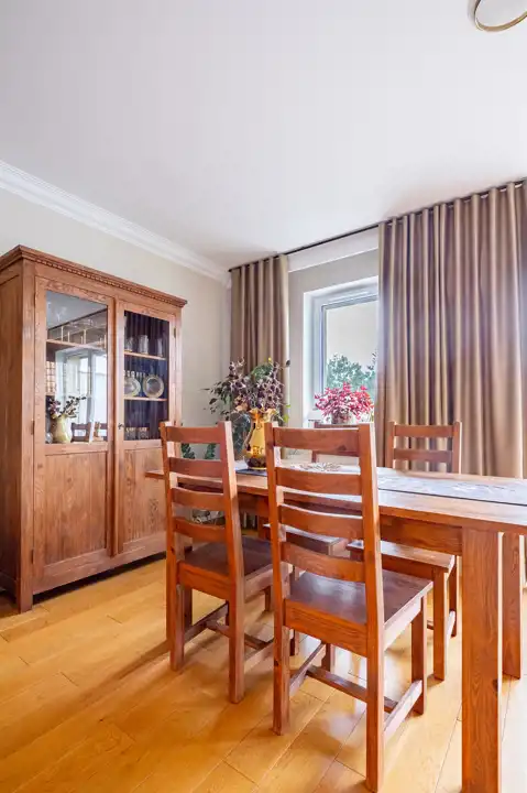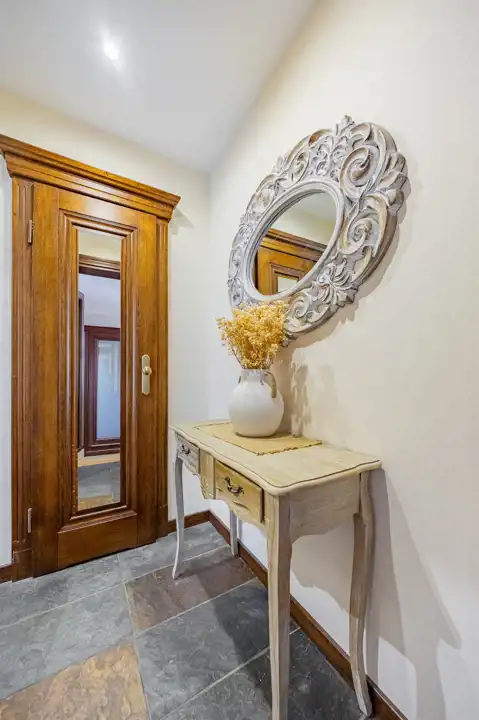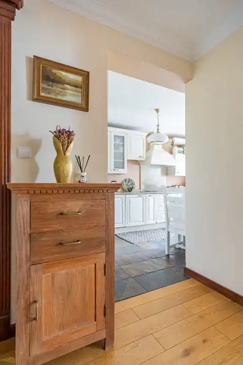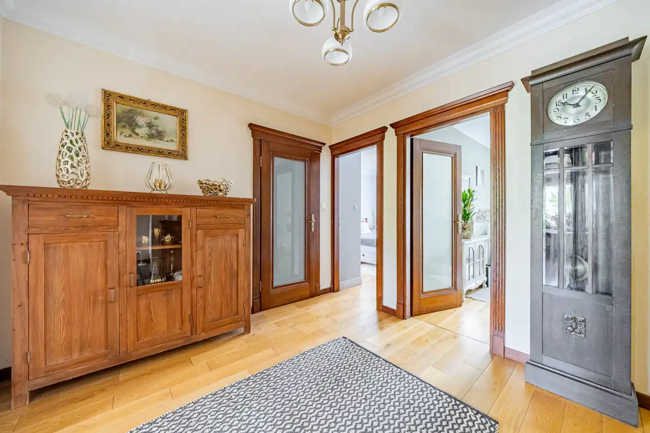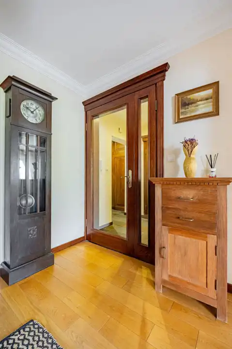 - Klasyka i Jakość: Na podłogach znajdą Państwo eleganckie, drewniane oraz kamienne podłogi, a wnętrza dopełniają solidne, stylowe drewniane drzwi.
