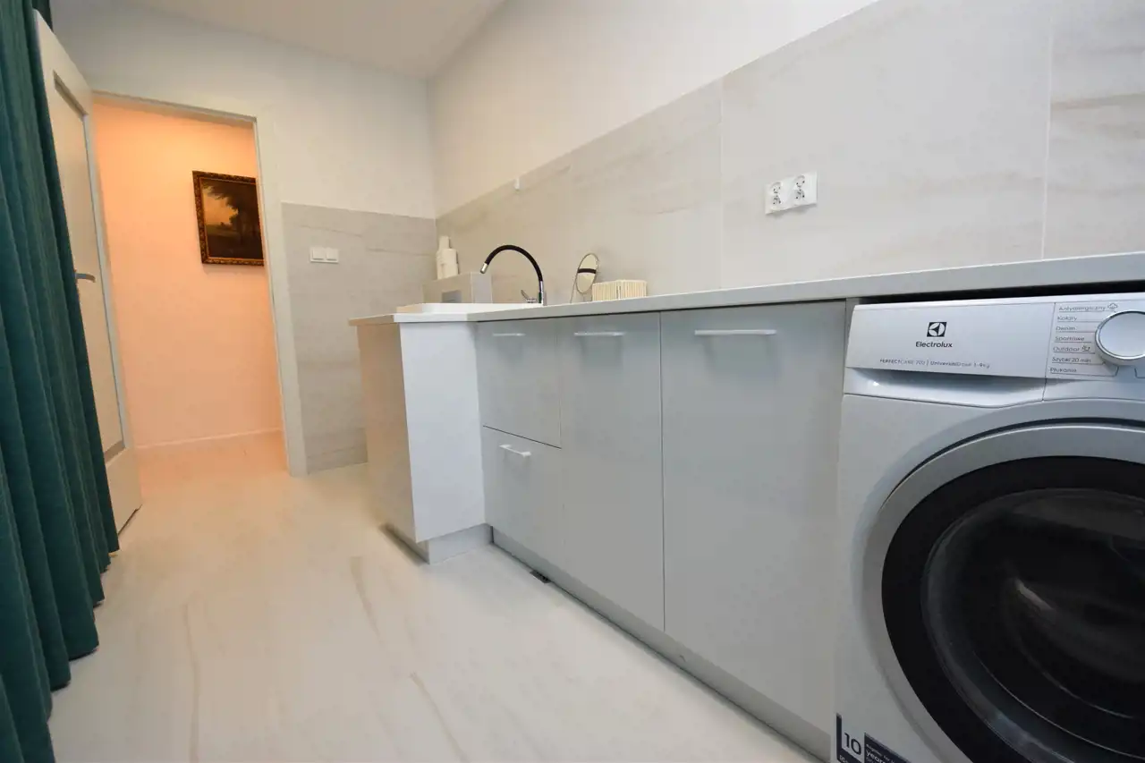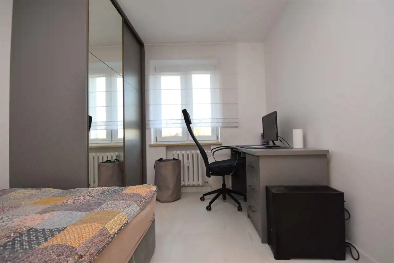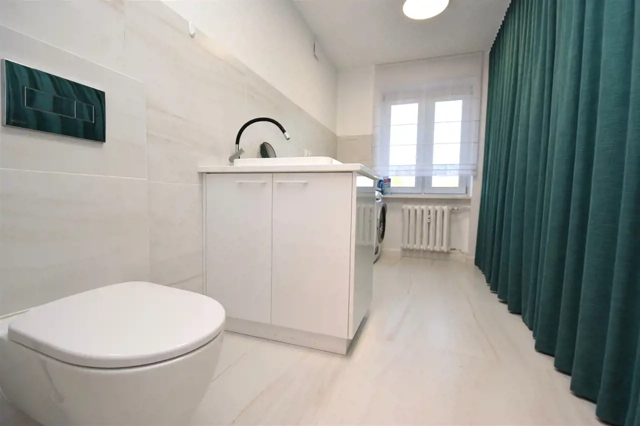 Apartament został zaprojektowany z myślą o wygodzie i funkcjonalności. Po generalnym remoncie zyskał zupełnie nowy charakter – wymieniono wszystkie instalacje, odświeżono ściany i podłogi, a także zamontowano nowe, solidne drzwi. Całość wykończono materiałami wysokiej jakości w jasnej, nowoczesnej kolorystyce, dzięki czemu wnętrze jest pełne światła i przestrzeni.