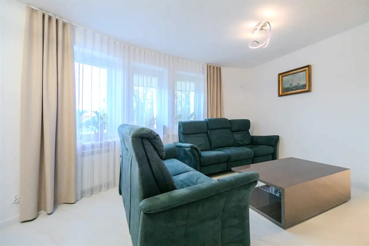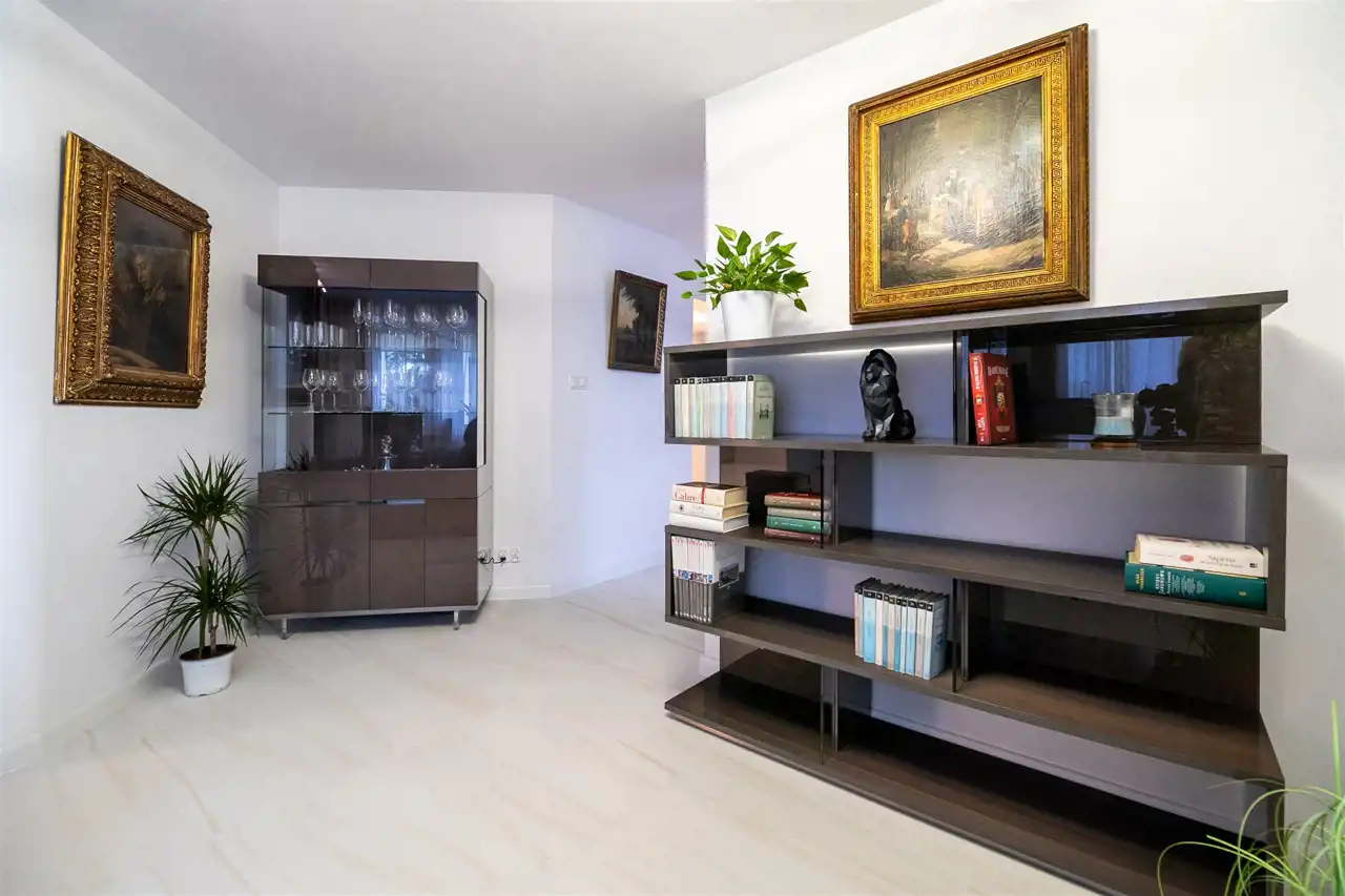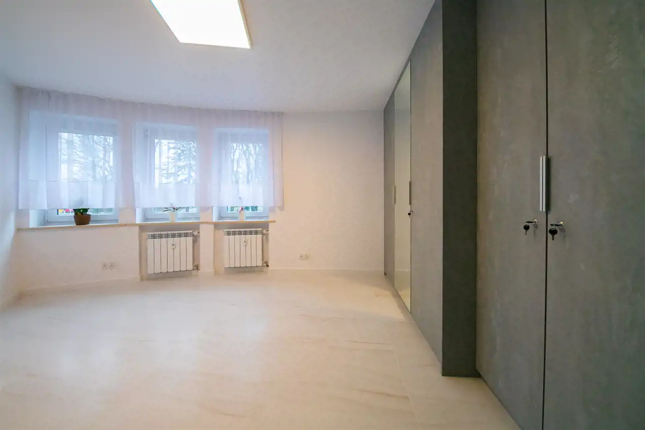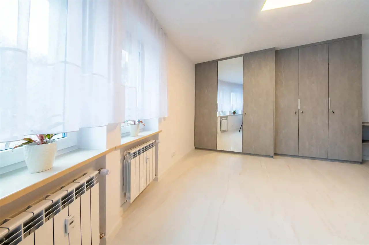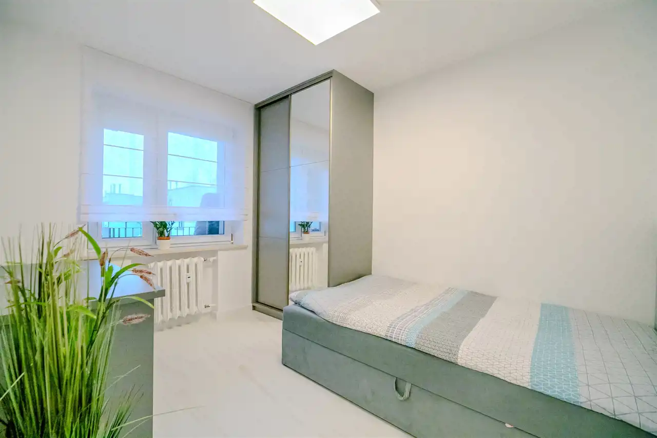 To nowoczesne wnętrze cechuje się funkcjonalnością i uniwersalną aranżacją. Apartament został całkowicie odnowiony według nowej, funkcjonalnej koncepcji, włącznie z wymianą instalacji, pokrycia ścian i podłóg. Zamontowane zostały wysokiej jakości drzwi. Każdy element zabudowy został starannie dobrany i zamontowany, aby zapewnić wysoki standard wykończenia. Całość wykończona jest w jasnych barwach, co w połączeniu z nowoczesnym oświetleniem sprawia pozytywne wrażenie od razu po przestąpieniu progu, a duże okna w pokojach oraz okna balkonowe zapewniają stały dostęp światła słonecznego.