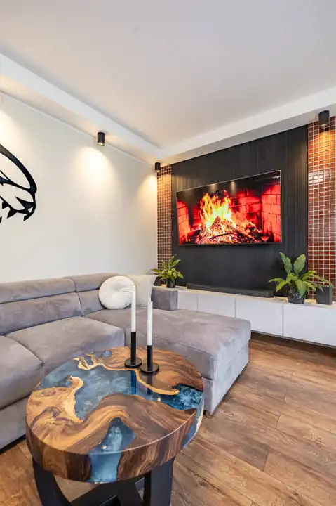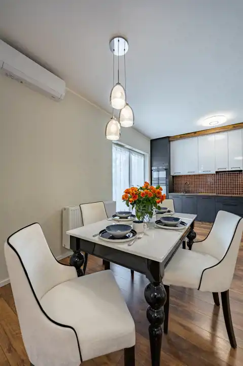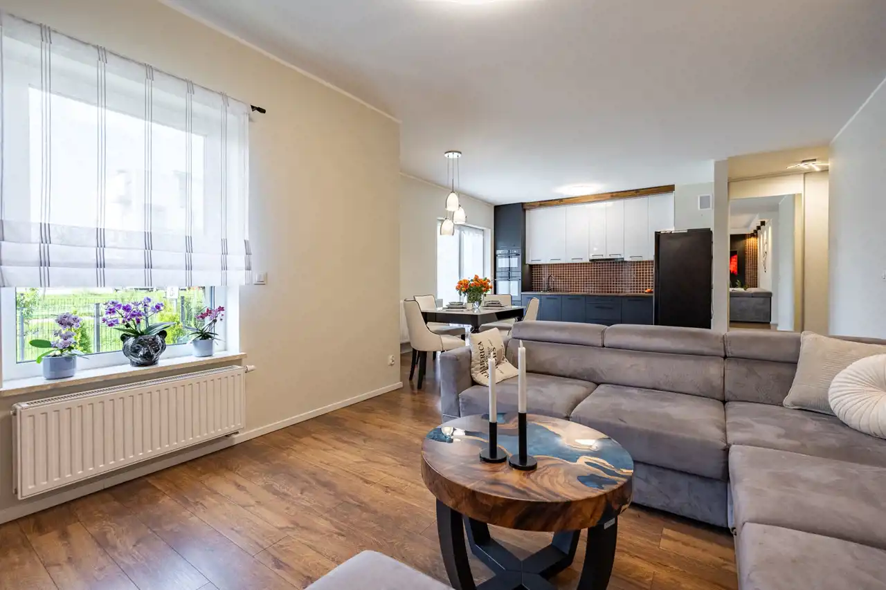 Kuchnia została wykonana na zamówienie, z wysokiej klasy materiałów i sprzętów AGD. Jej nowoczesna forma i spójna kolorystyka harmonizują z resztą wnętrza, tworząc elegancką i przytulną przestrzeń. W salonie zainstalowano klimatyzację, która zapewnia komfort termiczny przez cały rok.