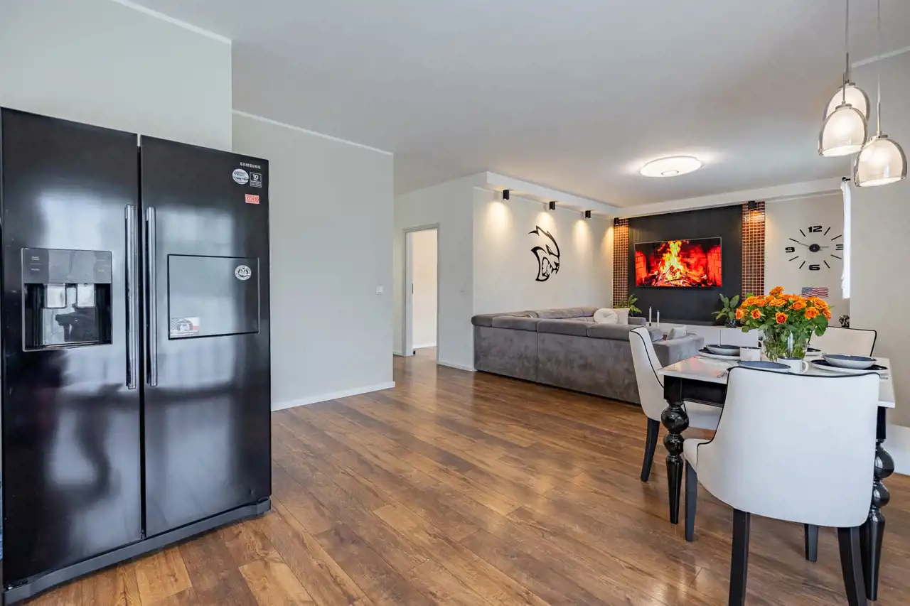 Kuchnia została wykonana na zamówienie, z wysokiej klasy materiałów i sprzętów AGD. Jej nowoczesna forma i spójna kolorystyka harmonizują z resztą wnętrza, tworząc elegancką i przytulną przestrzeń. W salonie zainstalowano klimatyzację, która zapewnia komfort termiczny przez cały rok.