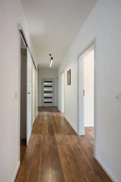 Przemyślany układ i wysoki standard wykończenia: Wnętrze zostało zaprojektowane z dbałością o każdy detal. Już od progu wita nas przestronny korytarz z pojemną szafą w zabudowie, która pełni funkcję garderoby i schowka. Z korytarza przechodzimy do otwartej strefy dziennej – salonu połączonego z jadalnią i kuchnią. To miejsce tętniące życiem, idealne do wspólnego spędzania czasu, a jednocześnie zaprojektowane tak, by zapewnić wygodę i prywatność.