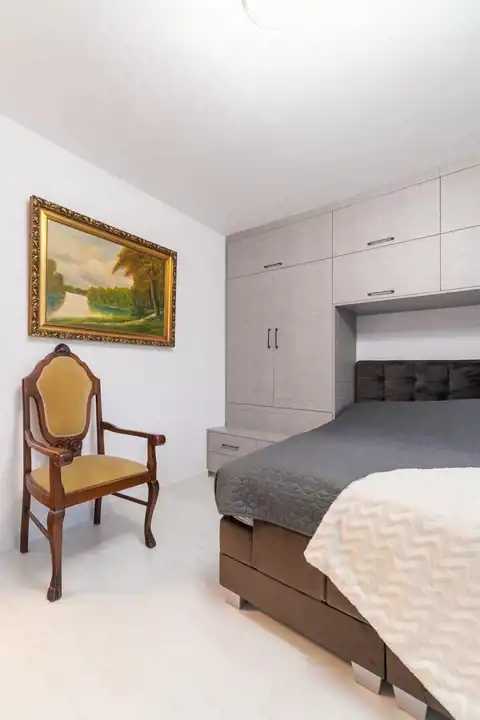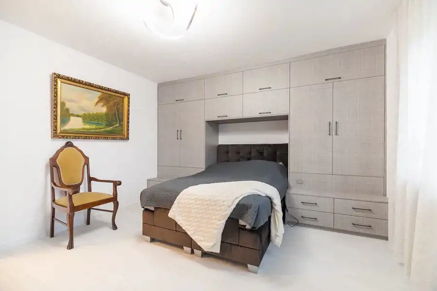 W głębi apartamentu znajdują się dwie bliźniacze pokoje i główna sypialnia z podwójnym łóżkiem oraz zabudową meblową na całej ścianie.