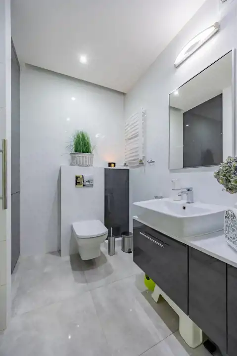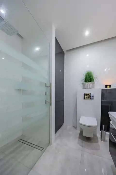 - Łazienka na dole – jasna, praktyczna, z ogrzewaniem podłogowym.